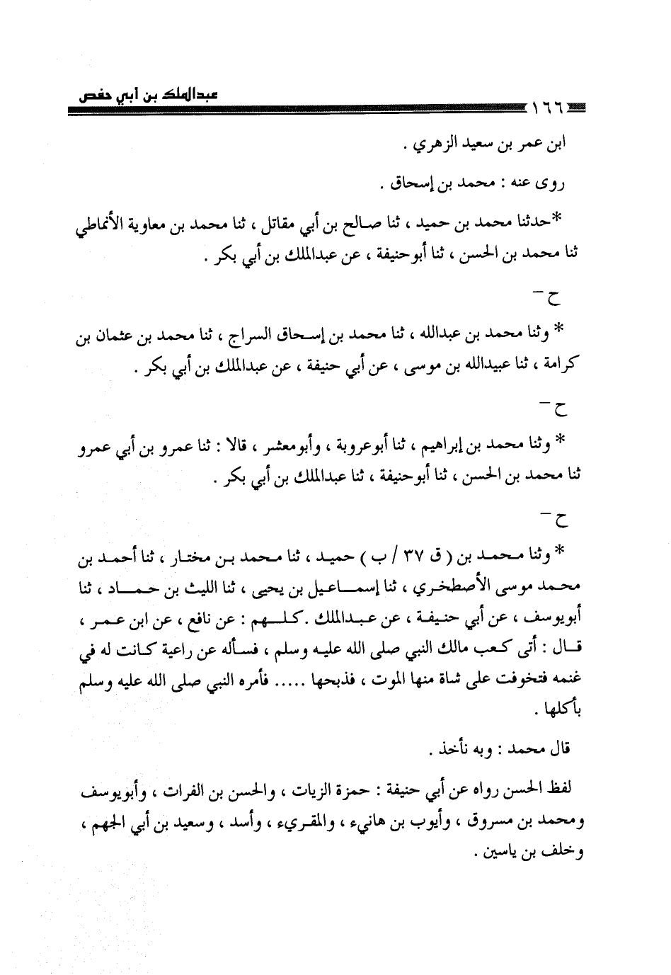 حَدَّثَنَا مُحَمَّدُ بْنُ حُمَيْدٍ، ثَنَا صَالِحُ بْنُ أَبِي مُقَاتِلٍ، ثَنَا مُحَمَّدُ بْنُ مُعَاوِيَةَ الْأَنْمَاطِيُّ، ثَنَا مُحَمَّدُ بْنُ الْحَسَنِ، ثَنَا أَبُو حَنِيفَةَ، عَنْ عَبْدِ الْمَلِكِ بْنِ أَبِي بَكْرٍ، ح وَثنا مُحَمَّدُ بْنُ عَبْدِ اللَّهِ، ثَنَا مُحَمَّدُ بْنُ إِسْحَاقَ السَّرَّاجُ، ثَنَا مُحَمَّدُ بْنُ عُثْمَانَ بْنِ كَرَامَةَ، ثَنَا عُبَيْدُ اللَّهِ بْنُ مُوسَى، عَنْ أَبِي حَنِيفَةَ، عَنْ عَبْدِ الْمَلِكِ بْنِ أَبِي بَكْرٍ، ح وَثنا مُحَمَّدُ بْنُ إِبْرَاهِيمَ، ثَنَا أَبُو عَرُوبَةَ، وَأَبُو مَعْشَرٍ قَالَا: ثَنَا عَمْرُو بْنُ أَبِي عَمْرٍو، ثَنَا مُحَمَّدُ بْنُ الْحَسَنِ، ثَنَا أَبُو حَنِيفَةَ، ثَنَا عَبْدُ الْمَلِكِ بْنُ أَبِي بَكْرٍ، ح وَثنا مُحَمَّدُ بْنُ حُمَيْدٍ، ثَنَا مُحَمَّدُ بْنُ مُخْتَارٍ، ثَنَا أَحْمَدُ بْنُ مُحَمَّدٍ، ثَنَا مُوسَى الْإِصْطَخْرِيُّ، ثَنَا إِسْمَاعِيلُ بْنُ يَحْيَى، ثَنَا اللَّيْثُ بْنُ حَمَّادٍ، ثَنَا أَبُو يُوسُفَ، عَنْ أَبِي حَنِيفَةَ، عَنْ عَبْدِ الْمَلِكِ، كُلُّهُمْ عَنْ نَافِعٍ، عَنِ ابْنِ عُمَرَ، قَالَ: «أَتَى كَعْبُ بْنُ مَالِكٍ النَّبِيَّ صَلَّى اللهُ عَلَيْهِ وَسَلَّمَ فَسَأَلَهُ عَنْ §رَاعِيَةٍ كَانَتْ لَهُ فِي غَنَمِهِ فَتَخَوَّفَتْ عَلَى شَاةٍ مِنْهَا الْمَوْتَ فَذَبَحَهَا فَأَمَرَهُ النَّبِيُّ صَلَّى اللهُ عَلَيْهِ وَسَلَّمَ بِأَكْلِهَا» قَالَ مُحَمَّدٌ: وَبِهِ نَأْخُذُ لَفْظُ الْحَسَنِ، رَوَاهُ عَنْ أَبِي حَنِيفَةَ: حَمْزَةُ الزَّيَّاتُ، وَالْحَسَنُ بْنُ الْفُرَاتِ، وَأَبُو يُوسُفَ، وَمُحَمَّدُ بْنُ مَسْرُوقٍ، وَأَيُّوبُ بْنُ هَانِئٍ، وَالْمُقْرِئُ، وَأَسَدٌ، وَسَعِيدُ بْنُ أَبِي الْجَهْمِ، وَخَلَفُ بْنُ يَاسِينَ -[167]- وَرَوَاهُ عُبَيْدُ اللَّهِ بْنُ عُمَرَ، وَاللَّيْثُ بْنُ سَعْدٍ، وَمَالِكُ بْنُ الْمُثَنَّى، وصَخْرُ بْنُ جُوَيْرِيَةَ، فِي آخَرِينَ عَنْ نَافِعٍ، عَنِ ابْنِ كَعْبٍ، عَنْ أَبِيهِ، وَرَوَاهُ ابْنُ أَبِي عَرُوبَةَ، عَنْ عُبَيْدِ اللَّهِ، عَنْ أَبِي حَنِيفَةَ وَقَالَ عَبْدُ الْمَلِكِ بْنُ جُرَيْجٍ: حَدَّثَنَا مُحَمَّدُ بْنُ عَلِيِّ بْنِ حُبَيْشٍ، ثَنَا عَبْدُ اللَّهِ بْنُ إِسْحَاقَ الْمَدَائِنِيُّ، ثَنَا أَحْمَدُ بْنُ حَازِمٍ، ثَنَا عُبَيْدُ اللَّهِ بْنُ مُوسَى، ثَنَا أَبُو حَنِيفَةَ، عَنْ عَبْدِ الْمَلِكِ بْنِ جُرَيْجٍ، عَنْ نَافِعٍ، عَنِ ابْنِ عُمَرَ، أَنَّ كَعْبَ بْنَ مَالِكٍ، أَتَى النَّبِيَّ صَلَّى اللهُ عَلَيْهِ وَسَلَّمَ فَسَأَلَهُ عَنْ رَاعِيَةٍ كَانَتْ لَهُ فِي غَنَمِهِ، كَذَا فِي كِتَابَيْ عَبْدِ الْمَلِكِ بْنِ جُرَيْجٍ، وَهُوَ عِنْدِي خَطَأٌ