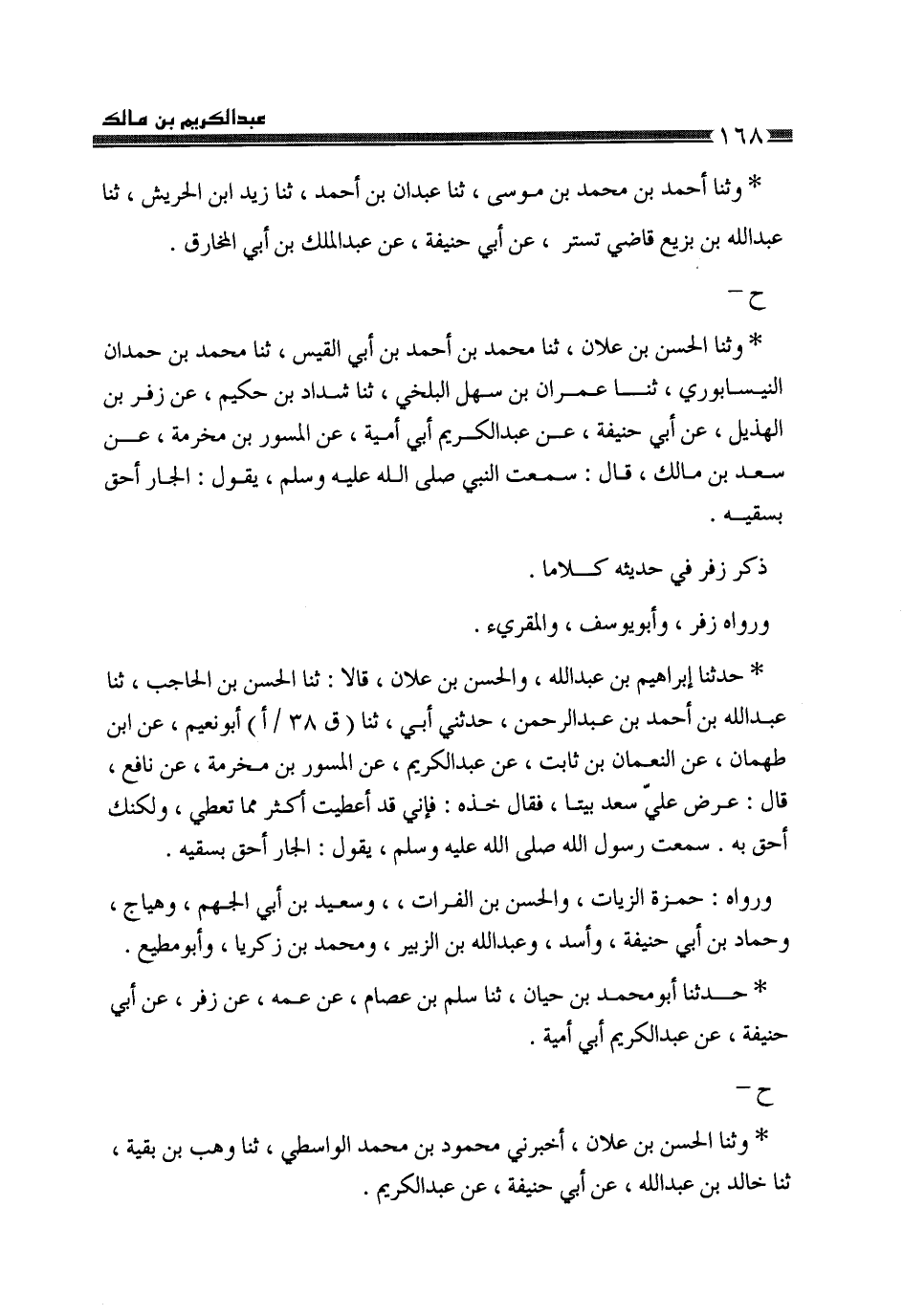 حَدَّثَنَا إِبْرَاهِيمُ بْنُ عَبْدِ اللَّهِ، وَالْحَسَنُ بْنُ عَلَّانَ، قَالَا: ثَنَا الْحَسَنُ بْنُ الْحَاجِبِ، ثَنَا عَبْدُ اللَّهِ بْنُ أَحْمَدَ بْنِ عَبْدِ الرَّحْمَنِ، حَدَّثَنِي أَبِي، ثَنَا أَبُو نُعَيْمٍ، عَنِ ابْنِ طَهْمَانَ، عَنِ النُّعْمَانِ بْنِ ثَابِتٍ، عَنْ عَبْدِ الْكَرِيمِ، عَنِ الْمِسْوَرِ بْنِ مَخْرَمَةَ، عَنْ نَافِعٍ، قَالَ: عَرَضَ عَلَيَّ سَعْدٌ بَيْتًا فَقَالَ: خُذْهُ، فَإِنِّي قَدْ أُعْطِيتُ أَكْثَرَ مِمَّا تُعْطِي، وَلَكِنَّكَ أَحَقُّ بِهِ، سَمِعْتُ رَسُولَ اللَّهِ صَلَّى اللهُ عَلَيْهِ وَسَلَّمَ يَقُولُ: «§الْجَارُ أَحَقُّ بِسَقْيِهِ» وَرَوَاهُ حَمْزَةُ الزَّيَّاتُ، وَالْحَسَنُ بْنُ الْفُرَاتِ، وَسَعِيدُ بْنُ أَبِي الْجَهْمِ، وَهَيَّاجٌ، وَحَمَّادُ بْنُ أَبِي حَنِيفَةَ، وَأَسَدٌ، وَعَبْدُ اللَّهِ بْنُ الزُّبَيْرِ، وَمُحَمَّدُ بْنُ زَكَرِيَّا، وَأَبُو مُطِيعٍ