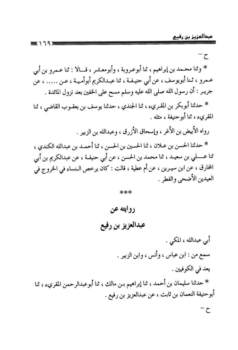 §رِوَايَتُهُ، عَنْ عَبْدِ الْعَزِيزِ بْنِ رُفَيْعٍ أَبِي عَبْدِ اللَّهِ الْمَكِّيِّ، سَمِعَ مِنَ ابْنِ عَبَّاسٍ، وَأَنَسٍ، وَابْنِ الزُّبَيْرِ، يُعَدُّ فِي الْكُوفِيِّينَ
