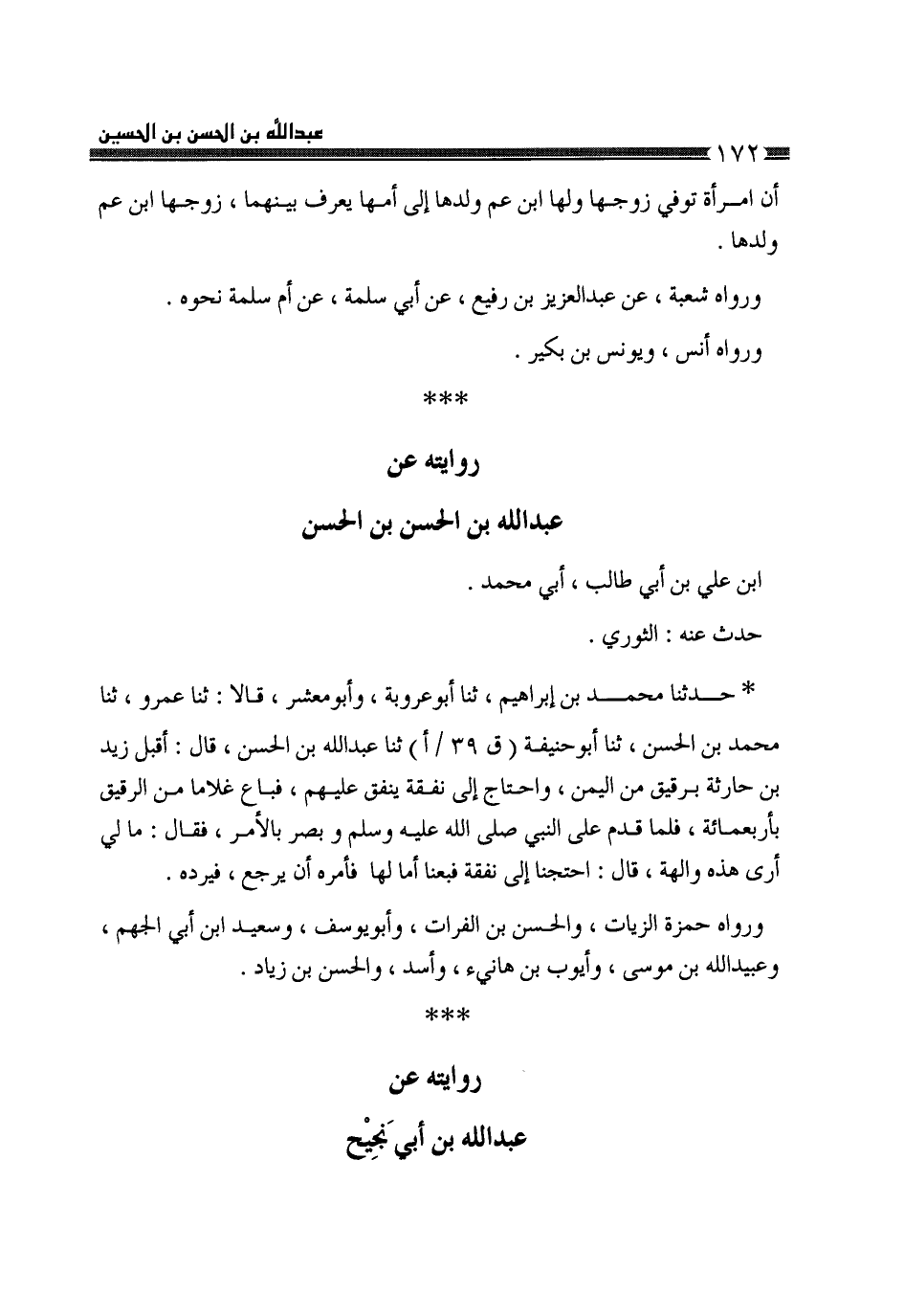 §رِوَايَتُهُ، عَنْ عَبْدِ اللَّهِ بْنِ الْحَسَنِ بْنِ الْحَسَنِ بْنِ عَلِيِّ بْنِ أَبِي طَالِبٍ، أَبِي مُحَمَّدٍ، حَدَّثَ عَنْهُ الثَّوْرِيُّ