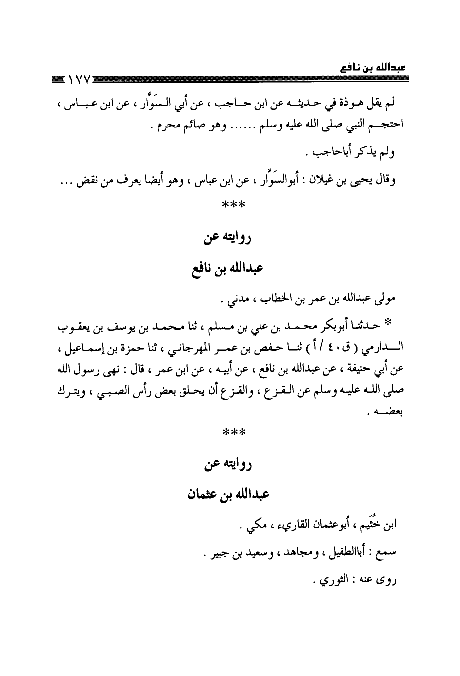 §رِوَايَتُهُ، عَنْ عَبْدِ اللَّهِ بْنِ نَافِعٍ مَوْلَى عَبْدِ اللَّهِ بْنِ عُمَرَ بْنِ الْخَطَّابِ، مَدَنِيٌّ