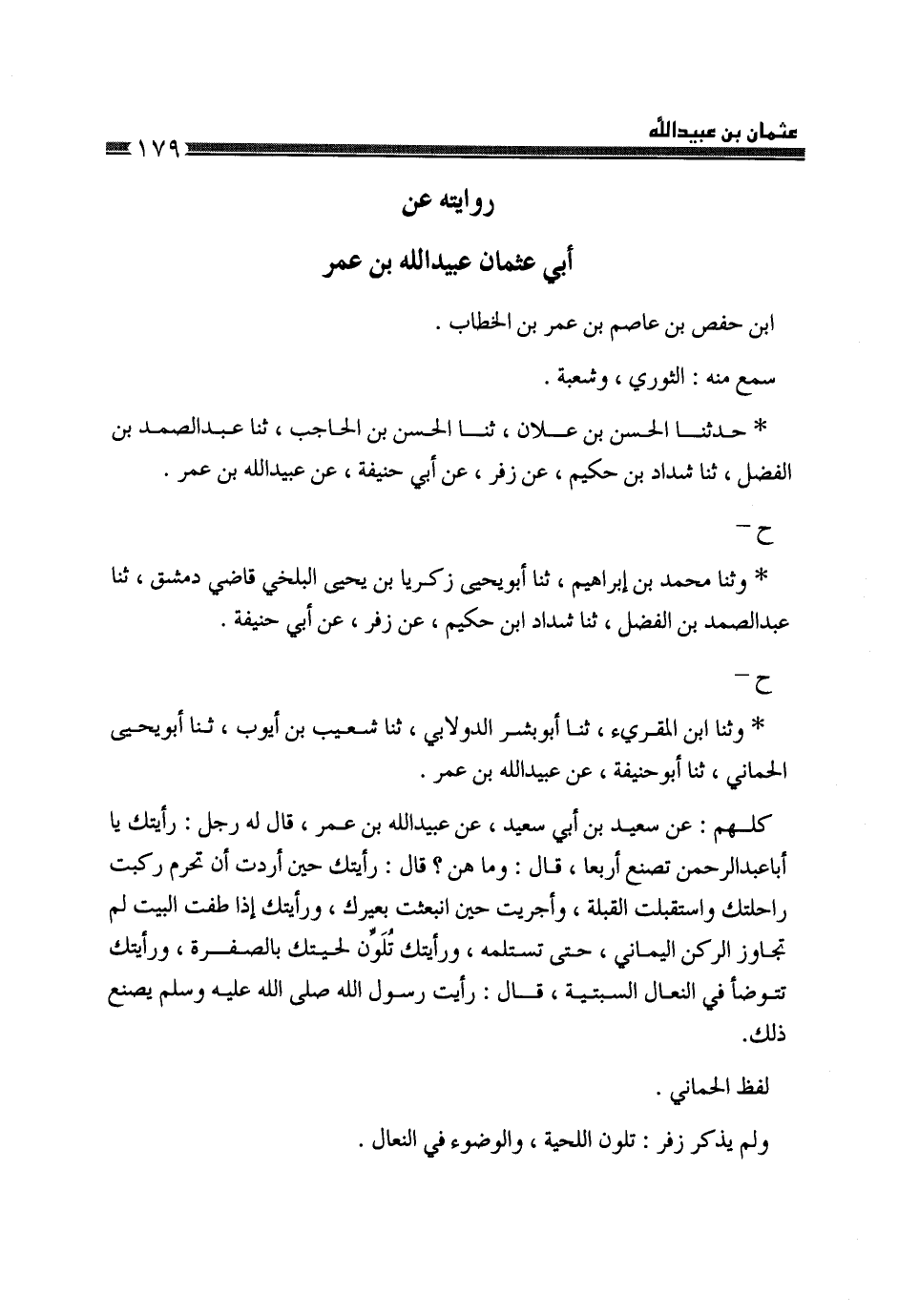 حَدَّثَنَا الْحَسَنُ بْنُ عَلَّانَ، ثَنَا الْحَسَنُ بْنُ الْحَاجِبِ، ثَنَا عَبْدُ الصَّمَدِ بْنُ الْفَضْلِ، ثَنَا شَدَّادُ بْنُ حَكِيمٍ، عَنْ زُفَرَ، عَنْ أَبِي حَنِيفَةَ، عَنْ عُبَيْدِ اللَّهِ بْنِ عُمَرَ، ح وَثنا مُحَمَّدُ بْنُ إِبْرَاهِيمَ، ثَنَا أَبُو يَحْيَى زَكَرِيَّا بْنُ يَحْيَى الْبَلْخِيُّ قَاضِي دِمَشْقَ، ثَنَا عَبْدُ الصَّمَدِ بْنُ الْفَضْلِ، ثَنَا شَدَّادُ بْنُ حَكِيمٍ، عَنْ زُفَرَ، عَنْ أَبِي حَنِيفَةَ، ح وَثنا ابْنُ الْمُقْرِئِ، ثَنَا أَبُو بِشْرٍ الدَّوْلَابِيُّ، ثَنَا شُعَيْبُ بْنُ أَيُّوبَ، ثَنَا أَبُو يَحْيَى الْحِمَّانِيُّ، ثَنَا أَبُو حَنِيفَةَ، عَنْ عُبَيْدِ اللَّهِ بْنِ عُمَرَ، كُلُّهُمْ، عَنْ سَعِيدِ بْنِ أَبِي سَعِيدٍ، عَنْ عَبْدِ اللَّهِ بْنِ عُمَرَ، قَالَ: قَالَ لَهُ رَجُلٌ: رَأَيْتُكَ يَا أَبَا عَبْدِ الرَّحْمَنِ تَصْنَعُ أَرْبَعًا قَالَ: وَمَا هُنَّ؟ قَالَ: رَأَيْتُكَ حِينَ أَرَدْتَ أَنْ تُحْرِمَ رَكِبْتَ رَاحِلَتَكَ، وَاسْتَقْبَلْتَ الْقِبْلَةَ، وَأَجْرَيْتَ حِينَ انْبَعَثَتْ بَعِيرُكَ، وَرَأَيْتُكَ إِذَا طُفْتَ الْبَيْتَ لَمْ تُجَاوِزِ الرُّكْنَ الْيَمَانِيَّ حَتَّى تَسْتَلِمَهُ، وَرَأَيْتُكَ تُلَوِّنُ لِحْيَتَكَ بِالصُّفْرَةِ، وَرَأَيْتُكَ تَتَوَضَّأُ فِي النِّعَالِ السِّبْتِيَّةِ قَالَ: «§رَأَيْتُ رَسُولَ اللَّهِ صَلَّى اللهُ عَلَيْهِ وَسَلَّمَ يَصْنَعُ ذَلِكَ» لَفْظُ الْحِمَّانِيِّ، وَلَمْ يَذْكُرْ زُفَرُ: تُلَوِّنُ اللِّحْيَةَ، وَالْوُضُوءَ فِي النِّعَالِ -[180]- حَدَّثَنَا أَبُو بَكْرِ بْنُ الْمُقْرِئِ، ثَنَا أَبُو عَرُوبَةَ، وَأَبُو مَعْشَرٍ قَالَا: ثَنَا عَمْرُو بْنُ أَبِي عَمْرٍو، ثَنَا مُحَمَّدُ بْنُ الْحَسَنِ، عَنْ أَبِي حَنِيفَةَ، ثَنَا عُبَيْدُ اللَّهِ بْنُ عُمَرَ، عَنْ نَافِعٍ، عَنِ ابْنِ عُمَرَ، قَالَ رَجُلٌ: يَا أَبَا عَبْدِ الرَّحْمَنِ رَأَيْتُكَ تَصْنَعُ أَرْبَعًا، فَقَالَ: فَذَكَرَهُ لَمْ يَرْوِهِ، عَنْ عُبَيْدِ اللَّهِ، عَنْ نَافِعٍ إِلَّا مُحَمَّدُ بْنُ الْحَسَنِ وَرَوَاهُ مُجَوَّدًا: أَبُو نُعَيْمٍ، عَنْ عَبْدِ الرَّحْمَنِ بْنِ هَانِي، عَنْ أَبِي حَنِيفَةَ، عَنْ عَبْدِ اللَّهِ بْنِ سَعِيدٍ الْمَقْبُرِيِّ، عَنْ عُبَيْدِ بْنِ جُرَيْجٍ، عَنِ ابْنِ عُمَرَ