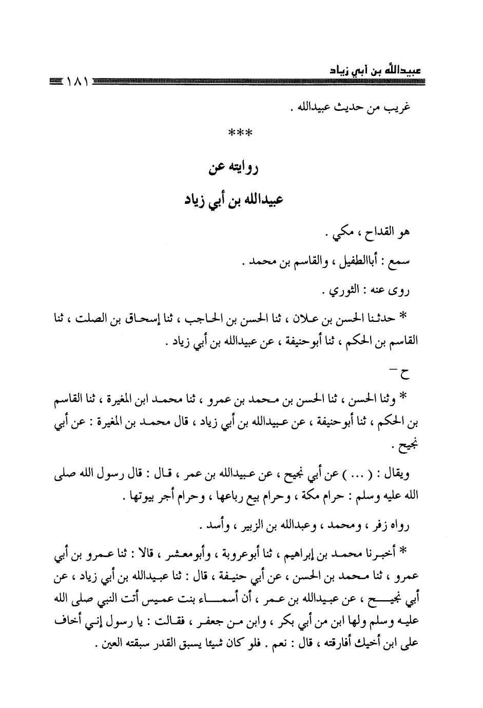 حَدَّثَنَا الْحَسَنُ بْنُ عَلَّانَ، ثَنَا الْحَسَنُ بْنُ الْحَاجِبِ، ثَنَا إِسْحَاقُ بْنُ الصَّلْتِ، ثَنَا الْقَاسِمُ بْنُ الْحَكَمِ، ثَنَا أَبُو حَنِيفَةَ، عَنْ عُبَيْدِ اللَّهِ بْنِ أَبِي زِيَادٍ، ح وَثنا الْحَسَنُ، ثَنَا الْحَسَنُ بْنُ مُحَمَّدِ بْنِ عَمْرٍو، ثَنَا مُحَمَّدُ بْنُ الْمُغِيرَةِ، ثَنَا الْقَاسِمُ بْنُ الْحَكَمِ، ثَنَا أَبُو حَنِيفَةَ، عَنْ عُبَيْدِ اللَّهِ بْنِ أَبِي زِيَادٍ، قَالَ مُحَمَّدُ بْنُ الْمُغِيرَةِ: عَنْ أَبِي نَجِيحٍ، وَيُقَالُ: (.. .) عَنْ أَبِي نَجِيحٍ، عَنْ عُبَيْدِ اللَّهِ بْنِ عُمَرَ، قَالَ: قَالَ رَسُولُ اللَّهِ صَلَّى اللهُ عَلَيْهِ وَسَلَّمَ: «§حَرَامٌ مَكَّةُ، وَحَرَامٌ بَيْعُ رِبَاعِهَا، وَحَرَامٌ أَجْرُ بُيُوتِهَا» رَوَاهُ زُفَرُ، وَمُحَمَّدُ، وَعَبْدُ اللَّهِ بْنُ الزُّبَيْرِ، وَأَسَدٌ