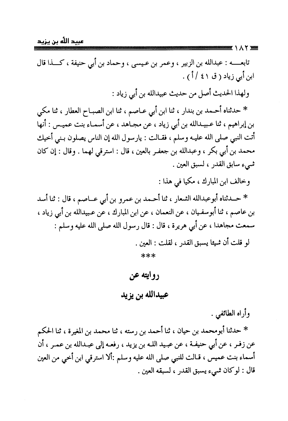 حَدَّثَنَا أَبُو مُحَمَّدِ بْنُ حَيَّانَ، ثَنَا أَحْمَدُ بْنُ رُسْتَهْ، ثَنَا مُحَمَّدُ بْنُ الْمُغِيرَةِ، ثَنَا الْحَكَمُ، عَنْ زُفَرَ، عَنْ أَبِي حَنِيفَةَ، عَنْ عُبَيْدِ اللَّهِ بْنِ يَزِيدَ، رَفَعَهُ إِلَى عَبْدِ اللَّهِ بْنِ عُمَرَ أَنَّ أَسْمَاءَ بِنْتَ عُمَيْسٍ، قَالَتْ لِلنَّبِيِّ صَلَّى اللهُ عَلَيْهِ وَسَلَّمَ: أَلَا أَسْتَرْقِي ابْنَ أَخِي مِنَ الْعَيْنِ، قَالَ: «§لَوْ كَانَ شَيْءٌ يَسْبِقُ الْقَدَرَ لَسَبَقَهُ الْعَيْنُ» -[183]- وَقَدْ رَوَى مُحَمَّدُ بْنُ إِسْحَاقَ، عَنْ عَبْدِ اللَّهِ بْنِ أَبِي نَجِيحٍ، فَخَالَفَهُ