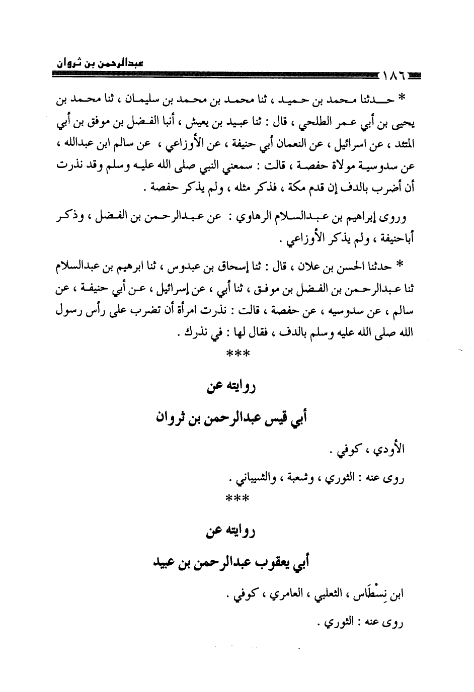 §رِوَايَتُهُ، عَنْ أَبِي يَعْقُوبَ عَبْدِ الرَّحْمَنِ بْنِ عُبَيْدِ بْنِ نِسْطَاسٍ الثعْلَبِيِّ الْعَامِرِيِّ، كُوفِيٌّ، رَوَى عَنْهُ الثَّوْرِيُّ