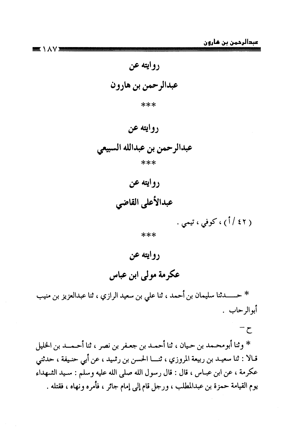 حَدَّثَنَا سُلَيْمَانُ بْنُ أَحْمَدَ، ثَنَا عَلِيُّ بْنُ سَعِيدٍ الرَّازِيُّ، ثَنَا عَبْدُ الْعَزِيزِ بْنُ مُنِيبٍ أَبُو الرِّحَابِ، ح وَثنا أَبُو مُحَمَّدِ بْنُ حَيَّانَ، ثَنَا أَحْمَدُ بْنُ جَعْفَرِ بْنِ نَصْرٍ، ثَنَا أَحْمَدُ بْنُ الْخَلِيلِ، قَالَا: ثَنَا سَعِيدُ بْنُ رَبِيعَةَ الْمَرْوَزِيُّ، ثَنَا الْحَسَنُ بْنُ رُشَيْدٍ، عَنْ أَبِي حَنِيفَةَ، حَدَّثَنِي عِكْرِمَةُ، عَنِ ابْنِ عَبَّاسٍ، قَالَ: قَالَ رَسُولُ اللَّهِ صَلَّى اللهُ عَلَيْهِ وَسَلَّمَ: «§سَيِّدُ الشُّهَدَاءِ يَوْمَ الْقِيَامَةِ حَمْزَةُ بْنُ عَبْدِ الْمُطَّلِبِ، وَرَجُلٌ قَامَ إِلَى إِمَامٍ جَائِرٍ فَأَمَرَهُ وَنَهَاهُ، فَقَتَلَهُ» -[188]- وَذَكَرَ فِي الْحَدِيثِ قِصَّةً لِإِبْرَاهِيمَ الصَّائِغِ فِي رِوَايَةِ أَحْمَدَ بْنِ الْخَلِيلِ