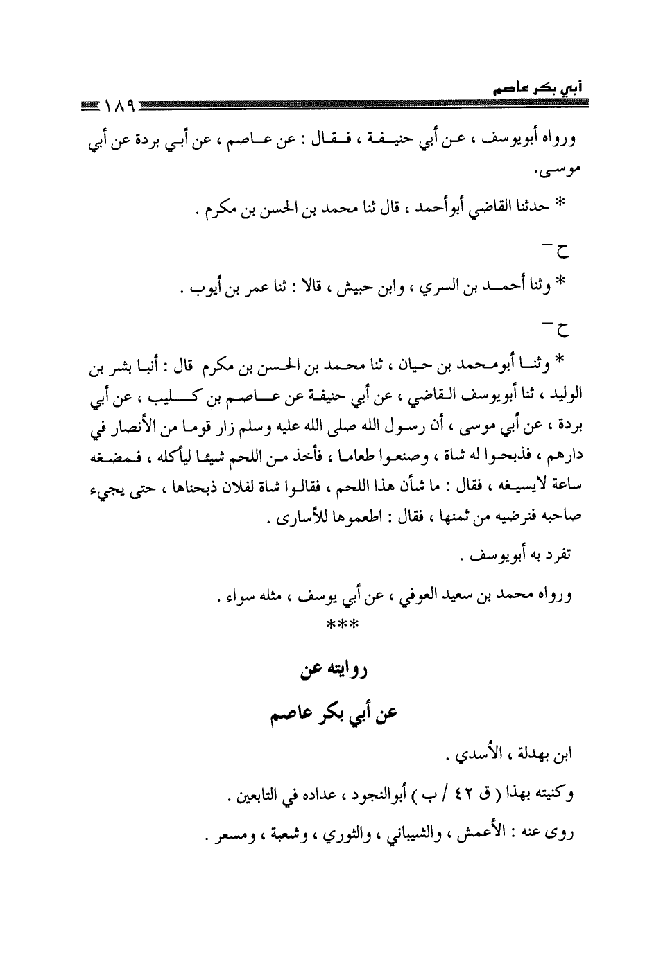 §رِوَايَتُهُ، عَنْ أَبِي بَكْرٍ عَاصِمِ ابْنِ بَهْدَلَةَ الْأَسَدِيِّ، وَكُنْيَتُهُ بِهَذَا أَبُو النَّجُودِ، عِدَادُهُ فِي التَّابِعِينَ، رَوَى عَنْهُ الْأَعْمَشُ، وَالشَّيْبَانِيُّ، وَالثَّوْرِيُّ، وَشُعْبَةُ، وَمِسْعَرٌ