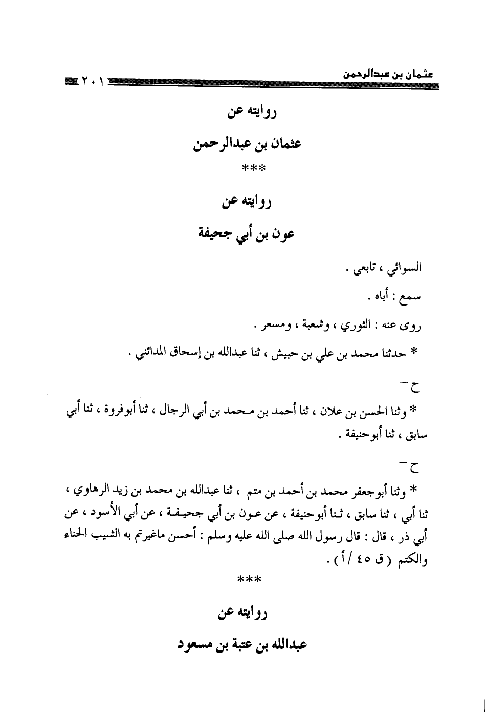 §رِوَايَتُهُ عَنْ عَوْنِ بْنِ أَبِي جُحَيْفَةَ السُّوَائِيِّ، تَابِعِيٌّ سَمِعَ أَبَاهُ، رَوَى عَنْهُ الثَّوْرِيُّ، وَشُعْبَةُ، وَمِسْعَرٌ