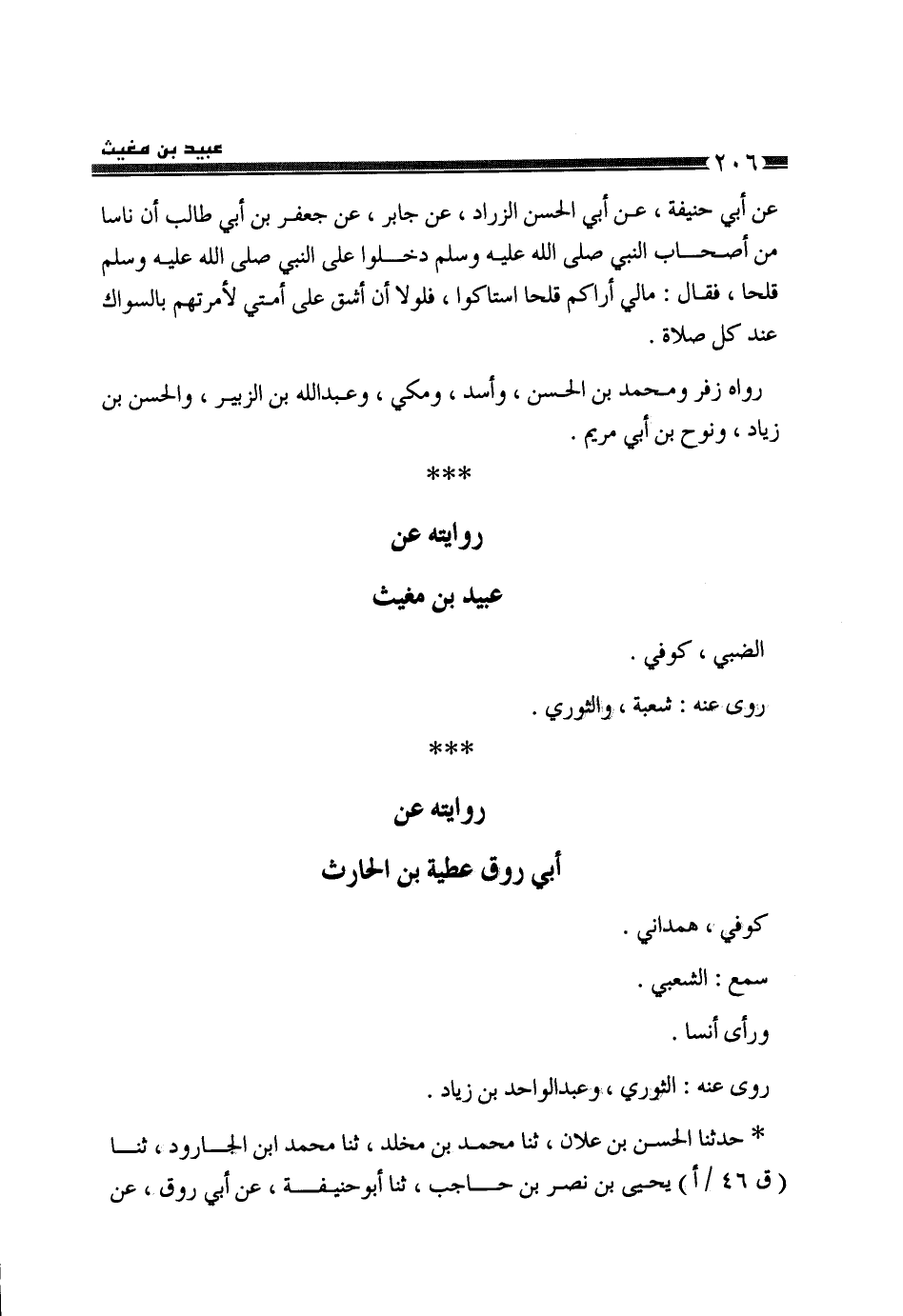 §رِوَايَتُهُ عَنْ أَبِي رَوْقٍ عَطِيَّةَ بْنَ الْحَارِثِ، كُوفِيٌّ هَمْدَانِيٌّ، سَمِعَ الشَّعْبِيَّ وَرَأَى أَنَسًا. رَوَى عَنْهُ الثَّوْرِيُّ وَعَبْدُ الْوَاحِدِ بْنُ زِيَادٍ