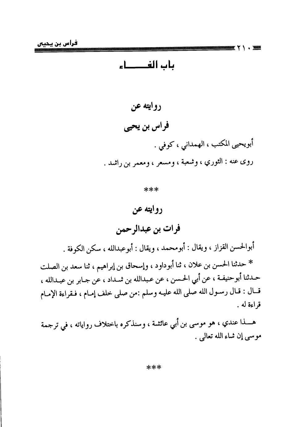 §رِوَايَتُهُ عَنْ فِرَاسِ بْنِ يَحْيَى أَبِي يَحْيَى الْمُكْتِبِ الْهَمْدَانِيِّ، كُوفِيٌّ، رَوَى عَنْهُ الثَّوْرِيُّ، وَشُعْبَةُ، وَمِسْعَرٌ، وَمُحَمَّدُ بْنُ رَاشِدٍ