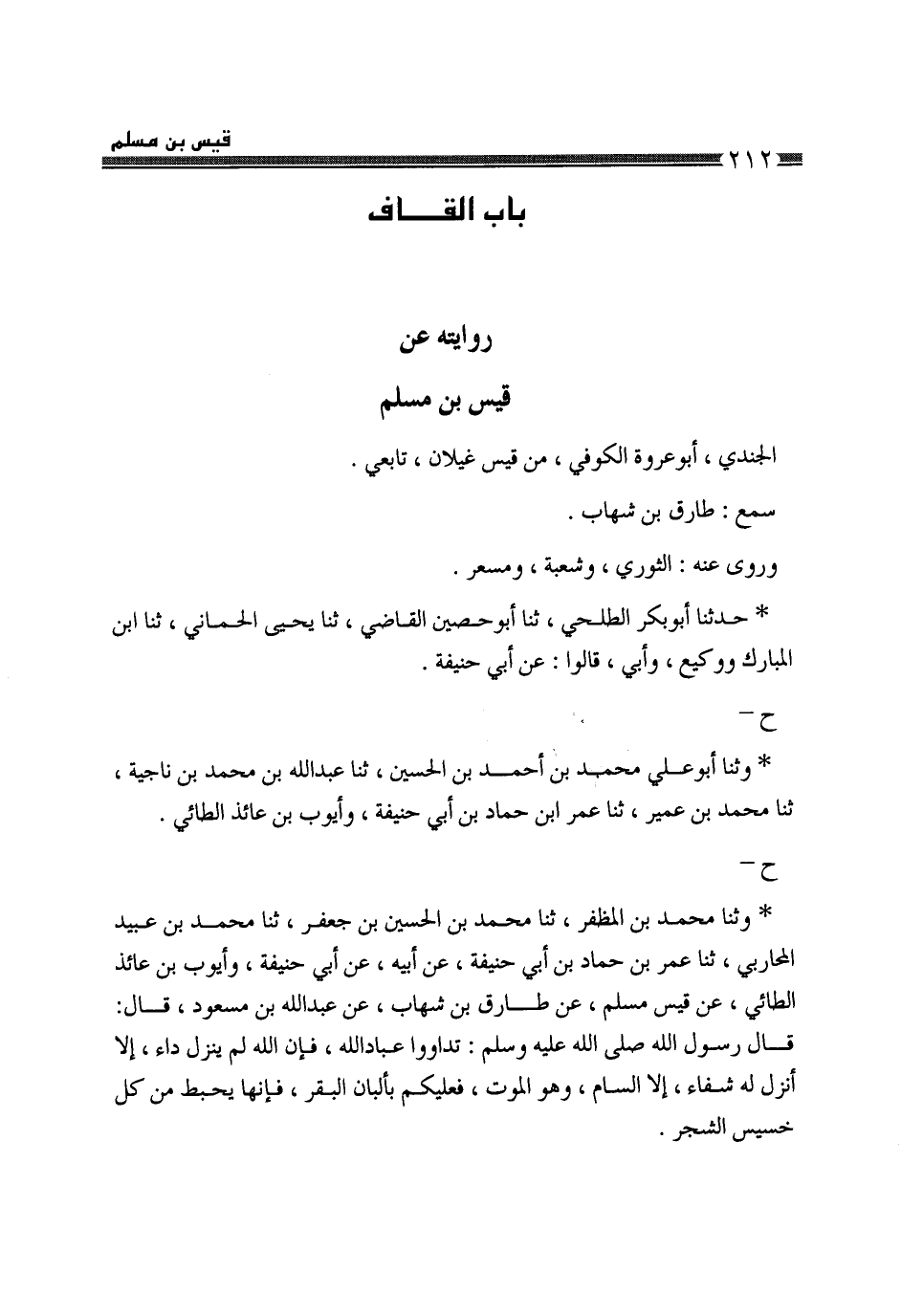 حَدَّثَنَا أَبُو بَكْرٍ الطَّلْحِيُّ، ثَنَا أَبُو حُصَيْنٍ الْقَاضِي، ثَنَا يَحْيَى الْحِمَّانِيُّ، ثَنَا ابْنُ الْمُبَارَكِ، وَوَكِيعٌ، وَأَبِي، قَالُوا: عَنْ أَبِي حَنِيفَةَ، ح وَثنا أَبُو عَلِيٍّ مُحَمَّدُ بْنُ أَحْمَدَ بْنِ الْحُسَيْنِ، ثَنَا عَبْدُ اللَّهِ بْنُ مُحَمَّدِ بْنِ نَاجِيَةَ، ثَنَا مُحَمَّدُ بْنُ عُمَيْرٍ، ثَنَا عُمَرُ بْنُ حَمَّادِ بْنِ أَبِي حَنِيفَةَ، وَأَيُّوبُ بْنُ عَائِذٍ الطَّائِيُّ، ح وَثنا مُحَمَّدُ بْنُ الْمُظَفَّرِ، ثَنَا مُحَمَّدُ بْنُ الْحُسَيْنِ بْنِ جَعْفَرٍ، ثَنَا مُحَمَّدُ بْنُ عُبَيْدٍ الْمُحَارِبِيُّ، ثَنَا عُمَرُ بْنُ حَمَّادِ بْنِ أَبِي حَنِيفَةَ، عَنْ أَبِيهِ، عَنْ أَبِي حَنِيفَةَ، وَأَيُّوبَ بْنِ عَائِذٍ الطَّائِيِّ، عَنْ قَيْسِ بْنِ مُسْلِمٍ، عَنْ طَارِقِ بْنِ شِهَابٍ، عَنْ عَبْدِ اللَّهِ بْنِ مَسْعُودٍ، قَالَ: قَالَ رَسُولُ اللَّهِ صَلَّى اللهُ عَلَيْهِ وَسَلَّمَ: «§تَدَاوَوْا عِبَادَ اللَّهِ، فَإِنَّ اللَّهَ لَمْ يُنْزِلْ دَاءً إِلَّا أَنْزَلَ لَهُ شِفَاءً إِلَّا السَّامَ، وَهُوَ الْمَوْتُ، فَعَلَيْكُمْ بِأَلْبَانِ الْبَقَرِ فَإِنَّهَا تُحْبِطُ مِنْ كُلِّ خَسِيسِ الشَّجَرِ» -[213]- حَدَّثَنَا مُحَمَّدُ بْنُ حُمَيْدٍ، ثَنَا أَحْمَدُ بْنُ عَبْدِ الْجَبَّارِ الصَّنْعَانِيُّ، ثَنَا عَبْدُ الرَّحْمَنِ بْنُ صَالِحٍ، ثَنَا أَبُو أُسَامَةَ، عَنِ النُّعْمَانِ بْنِ ثَابِتٍ، عَنْ قَيْسٍ، عَنْ طَارِقٍ، عَنْ عَبْدِ اللَّهِ، وَذَكَرَ الْحَدِيثَ وَرَوَاهُ حَاجِبُ بْنُ سُلَيْمَانَ، عَنِ الْمُقْرِئِ، عَنْ أَبِي حَنِيفَةَ، مِثْلَهُ، وَرَوَاهُ حَمْزَةُ وَالْحَسَنُ بْنُ الْفُرَاتِ وَسَابِقٌ وَأَيُّوبُ بْنُ هَانِئٍ وَأَسَدٌ وَمُحَمَّدُ بْنُ رَبِيعَةَ وَالْحَسَنُ بْنُ زِيَادٍ وَالصَّبَّاحُ بْنُ مُحَارِبٍ وَالْمُعَافَى بْنُ عِمْرَانَ وَيَحْيَى بْنُ نَصْرٍ
