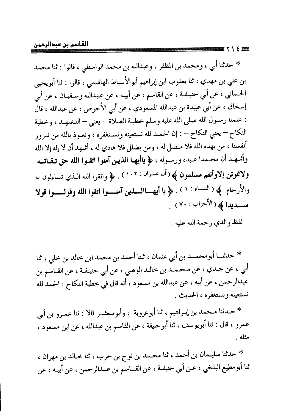 حَدَّثَنَا أَبِي وَمُحَمَّدُ بْنُ الْمُظَفَّرِ، وَعَبْدُ اللَّهِ بْنُ مُحَمَّدٍ الْوَاسِطِيُّ، قَالُوا: ثَنَا مُحَمَّدُ بْنُ عَلِيِّ بْنِ مَهْدِيٍّ، ثَنَا يَعْقُوبُ بْنُ إِبْرَاهِيمَ أَبُو الْأَسْبَاطِ الْهَاشِمِيُّ، قَالُوا: ثَنَا أَبُو يَحْيَى الْحِمَّانِيُّ، عَنْ أَبِي حَنِيفَةَ، عَنِ الْقَاسِمِ، عَنْ أَبِيهِ، عَنْ عَبْدِ اللَّهِ، وَسُفْيَانَ، عَنْ أَبِي إِسْحَاقَ، عَنْ أَبِي عُبَيْدَةَ بْنِ عَبْدِ اللَّهِ الْمَسْعُودِيِّ، عَنْ أَبِي الْأَحْوَصِ، عَنْ عَبْدِ اللَّهِ، قَالَ: «§عَلَّمَنَا رَسُولُ اللَّهِ صَلَّى اللهُ عَلَيْهِ وَسَلَّمَ خُطْبَةَ الصَّلَاةِ، يَعْنِي التَّشَهُّدَ، وَخُطْبَةَ النِّكَاحِ، يَعْنِي النِّكَاحَ: إِنَّ الْحَمْدَ لِلَّهِ نَسْتَعِينُهُ وَنَسْتَغْفِرُهُ، وَنَعُوذُ بِاللَّهِ مِنْ شُرُورِ أَنْفُسِنَا، مَنْ يَهْدِهِ اللَّهُ فَلَا مُضِلَّ لَهُ، وَمَنْ يُضْلِلْ فَلَا هَادِيَ لَهُ، أَشْهَدُ أَنْ لَا إِلَهَ إِلَّا اللَّهُ، وَأَشْهَدُ أَنَّ مُحَمَّدًا عَبْدُهُ وَرَسُولُهُ، {يَا أَيُّهَا الَّذِينَ آمَنُوا اتَّقُوا اللَّهَ حَقَّ تُقَاتِهِ وَلَا تَمُوتُنَّ إِلَّا وَأَنْتُمْ مُسْلِمُونَ} [آل عمرَان: 102] ، {وَاتَّقُوا اللَّهَ الَّذِي تَسَاءَلُونَ بِهِ وَالْأَرْحَامَ} [النِّسَاء: 1] ، {يَا أَيُّهَا الَّذِينَ آمَنُوا اتَّقُوا اللَّهَ وَقُولُوا قَوْلًا سَدِيدًا} [الْأَحْزَاب: 70] » لَفْظُ وَالِدِي رَحْمَةُ اللَّهِ عَلَيْهِ حَدَّثَنَا أَبُو مُحَمَّدِ بْنُ أَبِي عُثْمَانَ، ثَنَا أَحْمَدُ بْنُ مُحَمَّدِ بْنِ خَالِدِ بْنِ خَلِيٍّ، ثَنَا أَبِي عَنْ جَدِّي، عَنْ مُحَمَّدِ بْنِ خَالِدٍ الْوَهْبِيِّ، عَنْ أَبِي حَنِيفَةَ، عَنِ الْقَاسِمِ بْنِ عَبْدِ الرَّحْمَنِ، عَنْ أَبِيهِ، عَنْ عَبْدِ اللَّهِ بْنِ مَسْعُودٍ، أَنَّهُ قَالَ فِي خُطْبَةِ النِّكَاحِ: الْحَمْدُ لِلَّهِ نَسْتَعِينُهُ وَنَسْتَغْفِرُهُ، الْحَدِيثَ حَدَّثَنَا مُحَمَّدُ بْنُ إِبْرَاهِيمَ، ثَنَا أَبُو عَرُوبَةَ، وَأَبُو مَعْشَرٍ قَالَا: ثَنَا عَمْرُو بْنُ أَبِي عَمْرٍو قَالَ: ثَنَا أَبُو يُوسُفَ، ثَنَا أَبُو حَنِيفَةَ، عَنِ الْقَاسِمِ بْنِ عَبْدِ اللَّهِ، عَنِ ابْنِ مَسْعُودٍ، مِثْلَهُ