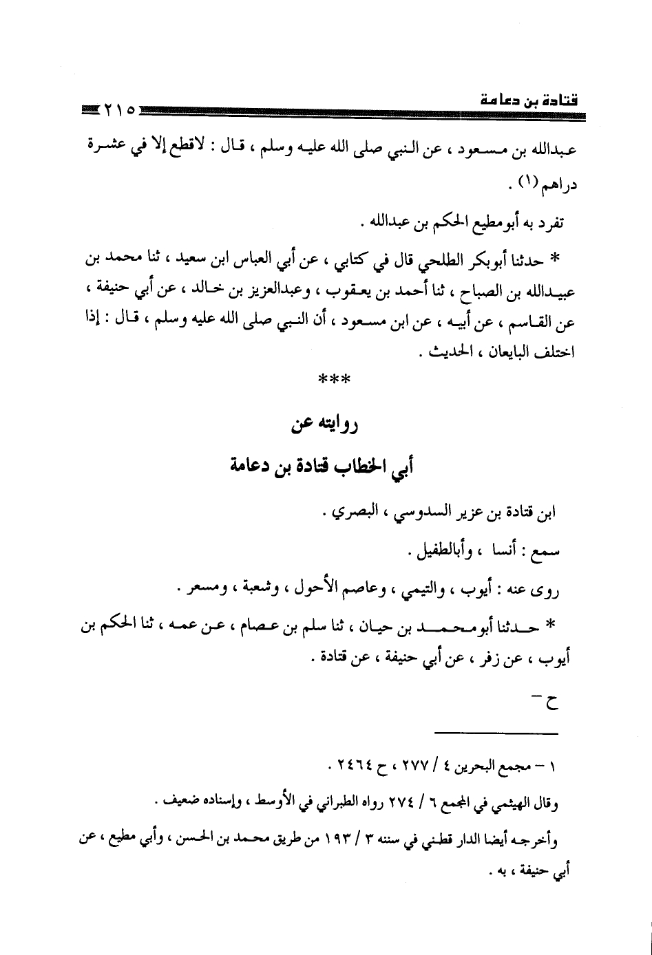 §رِوَايَتُهُ عَنْ أَبِي الْخَطَّابِ قَتَادَةَ بْنِ دِعَامَةَ بْنِ قَتَادَةَ بْنِ عُزَيْزٍ السَّدُوسِيِّ الْبَصْرِيِّ سَمِعَ أَنَسًا وَأَبَا الطُّفَيْلِ، رَوَى عَنْهُ أَيُّوبُ وَالتَّيْمِيُّ وَعَاصِمُ الْأَحْوَلُ وَشُعْبَةُ وَمِسْعَرٌ