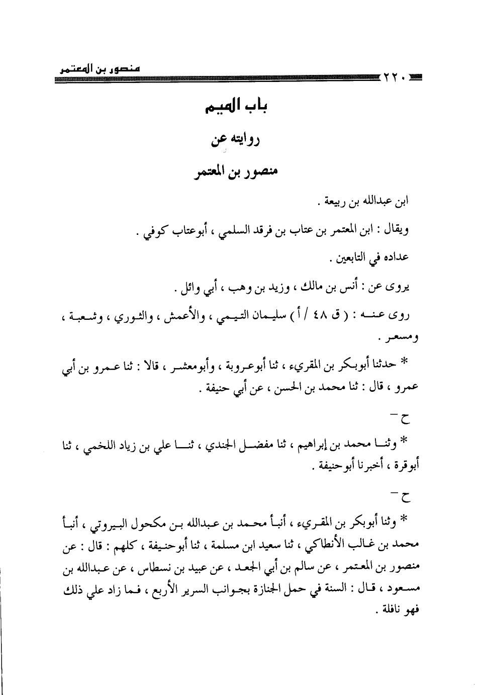 §رِوَايَتُهُ عَنْ مَنْصُورِ بْنِ الْمُعْتَمِرِ بْنِ عَبْدِ اللَّهِ بْنِ رَبِيعَةَ، وَيُقَالُ: ابْنُ الْمُعْتَمِرِ بْنِ عَتَّابِ بْنِ فَرْقَدٍ السُّلَمِيُّ أَبُو عَتَّابٍ، كُوفِيٌّ، عِدَادُهُ فِي التَّابِعِينَ، يَرْوِي عَنْ أَنَسِ بْنِ مَالِكٍ، وَزَيْدِ بْنِ وَهْبٍ أَبِي وَائِلٍ، رَوَى عَنْهُ، سُلَيْمَانُ التَّيْمِيُّ، وَالْأَعْمَشُ، وَالثَّوْرِيُّ، وَشُعْبَةُ، وَمِسْعَرٌ