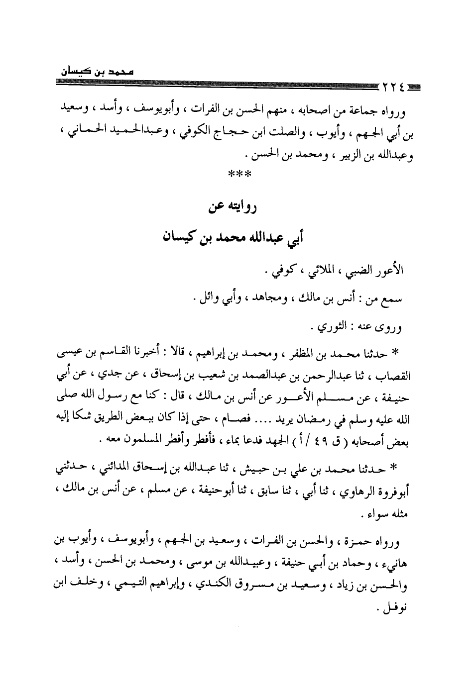 §رِوَايَتُهُ عَنْ أَبِي عَبْدِ اللَّهِ مُحَمَّدِ بْنِ كَيْسَانَ الْأَعْوَرِ الضَّبِّيِّ الْمُلَائِيِّ، كُوفِيٌّ، سَمِعَ مِنْ أَنَسِ بْنِ مَالِكٍ وَمُجَاهِدٍ وَأَبِي وَائِلٍ، وَرَوَى عَنْهُ الثَّوْرِيُّ