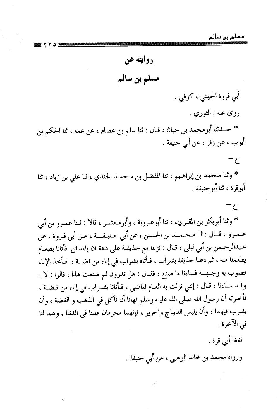 حَدَّثَنَا أَبُو مُحَمَّدِ بْنُ حَيَّانَ، قَالَ: ثَنَا سَلْمُ بْنُ عِصَامٍ، عَنْ عَمِّهِ، ثَنَا الْحَكَمُ بْنُ أَيُّوبَ، عَنْ زُفَرَ، عَنْ أَبِي حَنِيفَةَ، ح وَثنا مُحَمَّدُ بْنُ إِبْرَاهِيمَ، ثَنَا الْمُفَضَّلُ بْنُ مُحَمَّدٍ الْجَنَدِيُّ، ثَنَا عَلِيُّ بْنُ زِيَادٍ، ثَنَا أَبُو قُرَّةَ، ثَنَا أَبُو حَنِيفَةَ، ح وَثنا أَبُو بَكْرِ بْنُ الْمُقْرِئِ، ثَنَا أَبُو عَرُوبَةَ، وَأَبُو مَعْشَرٍ، قَالَا: ثَنَا عَمْرُو بْنُ أَبِي عَمْرٍو، قَالَ: ثَنَا مُحَمَّدُ بْنُ الْحَسَنِ، عَنْ أَبِي حَنِيفَةَ، عَنْ أَبِي فَرْوَةَ، عَنْ عَبْدِ الرَّحْمَنِ بْنِ أَبِي لَيْلَى، قَالَ: نَزَلْنَا مَعَ حُذَيْفَةَ عَلَى دِهْقَانٍ بِالْمَدَائِنِ، فَأَتَانَا بِطَعَامٍ يُطْعِمُنَا مِنْهُ، ثُمَّ دَعَا حُذَيْفَةُ بِشَرَابٍ، فَأَتَاهُ بِشَرَابٍ فِي إِنَاءٍ مِنْ فِضَّةٍ، فَأَخَذَ الْإِنَاءَ فَصَوَّبَ بِهِ وَجْهَهُ فَسَاءَنَا مَا صَنَعَ، فَقَالَ: هَلْ تَدْرُونَ لِمَ صَنَعْتُ هَذَا؟ قَالُوا: لَا، وَقَدْ سَاءَنَا، قَالَ: إِنَّنِي نَزَلْتُ بِهِ الْعَامَ الْمَاضِيَ فَأَتَانَا بِشَرَابٍ فِي إِنَاءٍ مِنْ فِضَّةٍ، فَأَخْبَرْتُهُ أَنَّ رَسُولَ اللَّهِ صَلَّى اللهُ عَلَيْهِ وَسَلَّمَ §نَهَانَا أَنْ نَأْكُلَ فِي الذَّهَبِ وَالْفِضَّةِ، وَأَنْ يُشْرَبَ فِيهِمَا وَأَنْ يُلْبَسَ الدِّيبَاجُ وَالْحَرِيرُ؛ فَإِنَّهُمَا مُحَرَّمَانِ عَلَيْنَا فِي الدُّنْيَا، وَهُمَا لَنَا فِي الْآخِرَةِ " لَفْظُ أَبِي قُرَّةَ، وَرَوَاهُ مُحَمَّدُ بْنُ خَالِدٍ الْوَهْبِيُّ، عَنْ أَبِي حَنِيفَةَ -[226]- وَلَفْظُ زُفَرَ مُخْتَصَرٌ، وَرَوَاهُ الْحَسَنُ بْنُ الْفُرَاتِ وَعُبَيْدُ اللَّهِ بْنُ مُوسَى، وَأَبُو يُوسُفَ، وَسَعِيدُ بْنُ أَبِي الْجَهْمِ، وَأَيُّوبُ بْنُ هَانِئٍ، وَأَسَدٌ، وَالْحَسَنُ بْنُ زِيَادٍ، وَمُحَمَّدُ بْنُ مَسْرُوقٍ