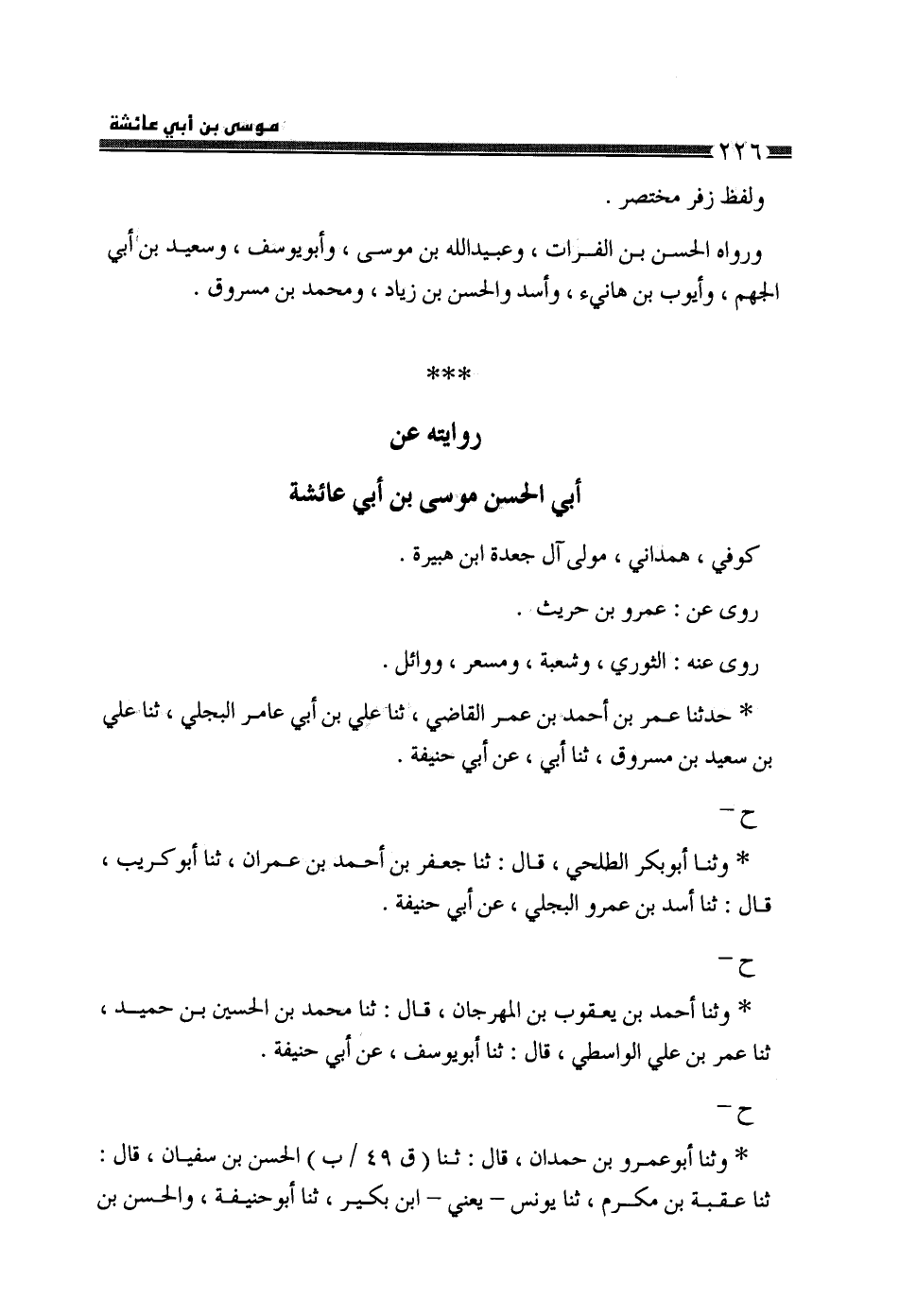 §رِوَايَتُهُ عَنْ أَبِي الْحَسَنِ مُوسَى بْنِ أَبِي عَائِشَةَ كُوفِيٌّ هَمْدَانِيٌّ، مَوْلَى آلِ جَعْدَةَ بْنِ هُبَيْرَةَ، رَوَى عَنْ عَمْرِو بْنِ حُرَيْثٍ، رَوَى عَنْهُ الثَّوْرِيُّ، وَشُعْبَةُ، وَمِسْعَرٌ، وَوَائِلٌ