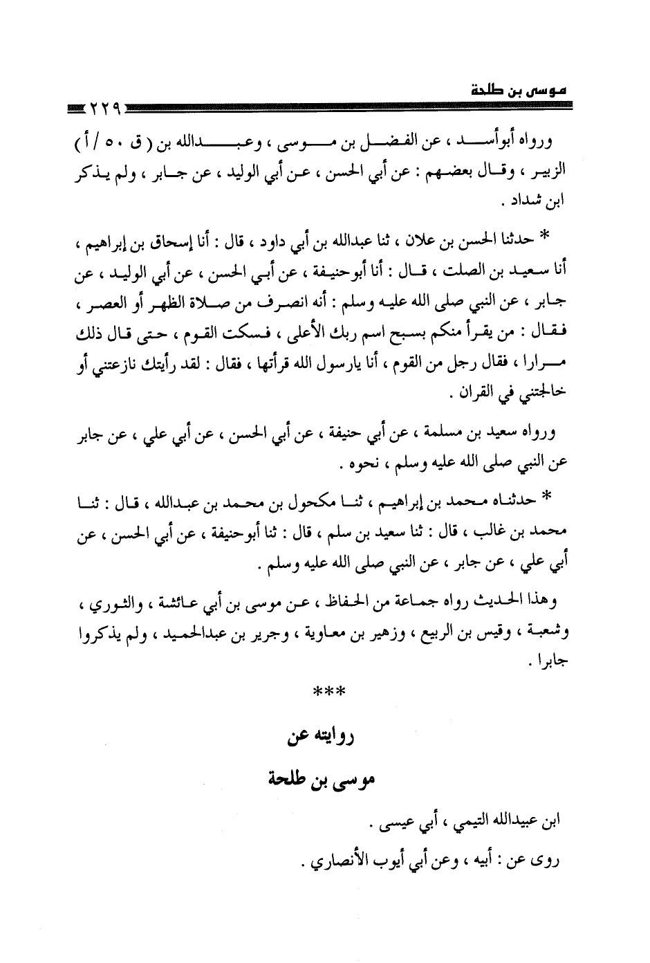 §رِوَايَتُهُ عَنْ مُوسَى بْنِ طَلْحَةَ بْنِ عُبَيْدِ اللَّهِ التَّيْمِيِّ أَبِي عِيسَى رَوَى عَنْهُ أَبِيهِ، وَعَنْ أَبِي أَيُّوبَ الْأَنْصَارِيِّ -[230]- كَانَ مِنَ الْفُقَهَاءِ، مَاتَ سَنَةَ أَرْبَعٍ وَمِائَةٍ، رَوَى عَنْهُ أَبُو إِسْحَاقَ وَسِمَاكُ بْنُ حَرْبٍ
