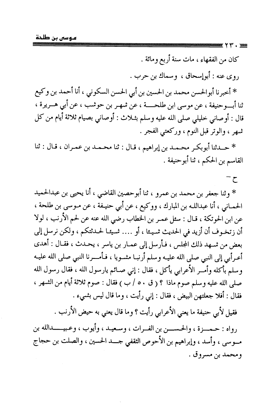 حَدَّثَنَا أَبُو بَكْرٍ مُحَمَّدُ بْنُ إِبْرَاهِيمَ، قَالَ: ثَنَا مُحَمَّدُ بْنُ عِمْرَانَ، قَالَ: ثَنَا الْقَاسِمُ بْنُ الْحَكَمِ، ثَنَا أَبُو حَنِيفَةَ ح، وَثنا جَعْفَرُ بْنُ مُحَمَّدِ بْنِ عَمْرٍو، ثَنَا أَبُو حُصَيْنٍ الْقَاضِي، أَنا يَحْيَى بْنُ عَبْدِ الْحَمِيدِ الْحِمَّانِيُّ، أَنا عَبْدُ اللَّهِ بْنُ الْمُبَارَكِ، وَوَكِيعٌ، عَنْ أَبِي حَنِيفَةَ، عَنْ مُوسَى بْنِ طَلْحَةَ، عَنِ ابْنِ الْحَوْتَكَةِ قَالَ: سُئِلَ عُمَرُ بْنُ الْخَطَّابِ رَضِيَ اللَّهُ عَنْهُ عَنْ لَحْمِ الْأَرْنَبِ، لَوْلَا أَنْ أَتَخَوَّفَ أَنْ أَزِيدَ فِي الْحَدِيثِ شَيْئًا أَوْ.. . شَيْئًا لَحَدَّثْتُكُمْ، وَلَكِنْ نُرْسِلُ إِلَى بَعْضِ مَنْ شَهِدَ ذَلِكَ الْمَجْلِسَ، فَأَرْسَلَ إِلَى عَمَّارِ بْنِ يَاسِرٍ يُحَدِّثُ، فَقَالَ: §أَهْدَى أَعْرَابِيٌّ إِلَى النَّبِيِّ صَلَّى اللهُ عَلَيْهِ وَسَلَّمَ أَرْنَبًا مَشْوِيًّا، فَأَمَرَنَا النَّبِيُّ صَلَّى اللهُ عَلَيْهِ وَسَلَّمَ بِأَكْلِهِ، وَأَمَرَ الْأَعْرَابِيَّ يَأْكُلُ، فَقَالَ: إِنِّي صَائِمٌ يَا رَسُولَ اللَّهِ، فَقَالَ رَسُولُ اللَّهِ صَلَّى اللهُ عَلَيْهِ وَسَلَّمَ: «صَوْمُ مَاذَا؟» فَقَالَ: صَوْمُ ثَلَاثَةِ أَيَّامٍ مِنَ الشَّهْرِ، فَقَالَ «أَفَلَا جَعَلْتَهُنَّ الْبِيضَ» فَقَالَ: إِنِّي رَأَيْتُ، وَمَا قَالَ لَيْسَ بِشَيْءٍ، فَقِيلَ لِأَبِي حَنِيفَةَ مَا يَعْنِي الْأَعْرَابِيُّ رَأَيْتُ؟ وَمَا قَالَ: يَعْنِي بِهِ حِيَضِ الْأَرْنَبِ رَوَاهُ حَمْزَةُ، وَالْحَسَنُ بْنُ الْفُرَاتِ، وَسَعِيدٌ، وَأَيُّوبُ، وَعُبَيْدُ اللَّهِ بْنُ مُوسَى، وَأَسَدٌ، وَإِبْرَاهِيمُ بْنُ الْأَحْوَصِ الثَّقَفِيُّ، جَدُّ الْحُسَيْنِ، وَالصَّلْتُ بْنُ حَجَّاجٍ، وَمُحَمَّدُ بْنُ مَسْرُوقٍ -[231]- وَرَوَاهُ إِبْرَاهِيمُ بْنُ طَهْمَانَ عَنْ أَبِي حَنِيفَةَ، عَنِ الْهَيْثَمِ، عَنْ مُوسَى بْنِ طَلْحَةَ، عَنِ ابْنِ الْحَوْتَكَةِ، عَنْ عُمَرَ، بِمِثْلِهِ