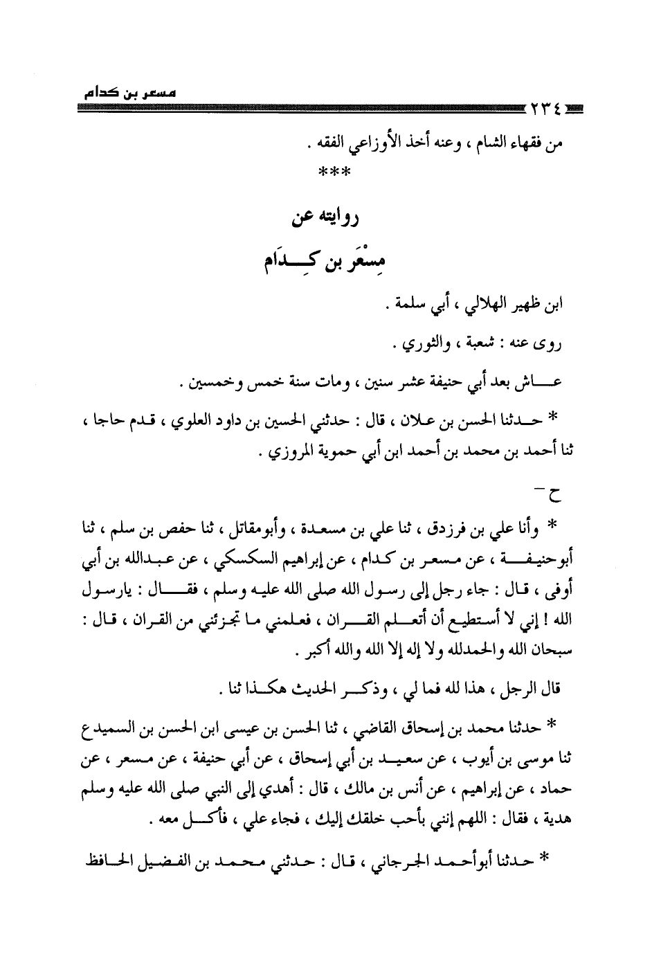 §رِوَايَتُهُ عَنْ مِسْعَرِ بْنِ كِدَامِ بْنِ ظُهَيْرٍ الْهِلَالِيِّ أَبِي سَلَمَةَ رَوَى عَنْهُ شُعْبَةُ وَالثَّوْرِيُّ، عَاشَ بَعْدَ أَبِي حَنِيفَةَ عَشْرَ سِنِينَ، وَمَاتَ سَنَةَ خَمْسٍ وَخَمْسِينَ