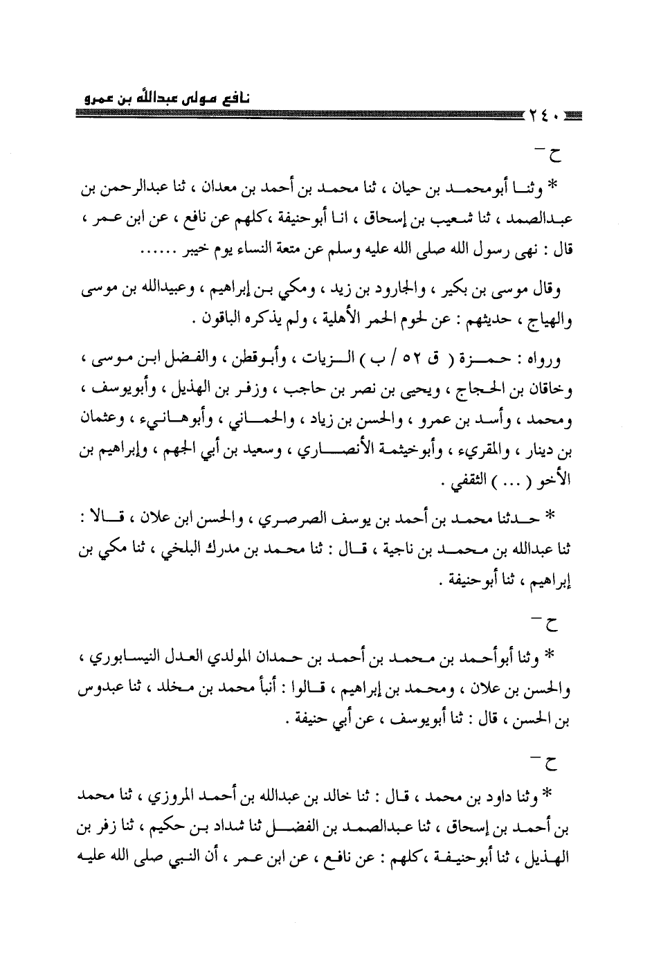 حَدَّثَنَا مُحَمَّدُ بْنُ أَحْمَدَ بْنِ يُوسُفَ الصَّرْصَرِيُّ، وَالْحَسَنُ بْنُ عَلَّانَ، قَالَا: ثَنَا عَبْدُ اللَّهِ بْنُ مُحَمَّدِ بْنِ نَاجِيَةَ، قَالَ: ثَنَا مُحَمَّدُ بْنُ مُدْرِكٍ الْبَلْخِيُّ، ثَنَا مَكِّيُّ بْنُ إِبْرَاهِيمَ، ثَنَا أَبُو حَنِيفَةَ، ح وَثنا أَبُو أَحْمَدَ بْنُ مُحَمَّدِ بْنِ أَحْمَدَ بْنِ حَمْدَانَ الْمُوَلِّدِيُّ الْعَدْلُ النَّيْسَابُورِيُّ، وَالْحَسَنُ بْنُ عَلَّانَ، وَمُحَمَّدُ بْنُ إِبْرَاهِيمَ، قَالُوا: أنبأ مُحَمَّدُ بْنُ مَخْلَدٍ، ثَنَا عَبْدُوسُ بْنُ الْحَسَنِ، قَالَ: ثَنَا أَبُو يُوسُفَ، عَنْ أَبِي حَنِيفَةَ، ح وَثنا دَاوُدُ بْنُ مُحَمَّدٍ، قَالَ: ثَنَا خَالِدُ بْنُ عَبْدِ اللَّهِ بْنِ أَحْمَدَ الْمَرْوَزِيُّ، ثَنَا مُحَمَّدُ بْنُ أَحْمَدَ بْنِ إِسْحَاقَ، ثَنَا عَبْدُ الصَّمَدِ بْنُ الْفَضْلِ، ثَنَا شَدَّادُ بْنُ حَكِيمٍ، ثَنَا زُفَرُ بْنُ الْهُذَيْلِ، ثَنَا أَبُو حَنِيفَةَ، كُلُّهُمْ عَنْ نَافِعٍ، عَنِ ابْنِ عُمَرَ، أَنَّ النَّبِيَّ صلّى الله عَلَيْهِ -[241]- وَسلم قَالَ: «§مَنْ أَتَى الْجُمُعَةَ فَلْيَغْتَسِلْ»