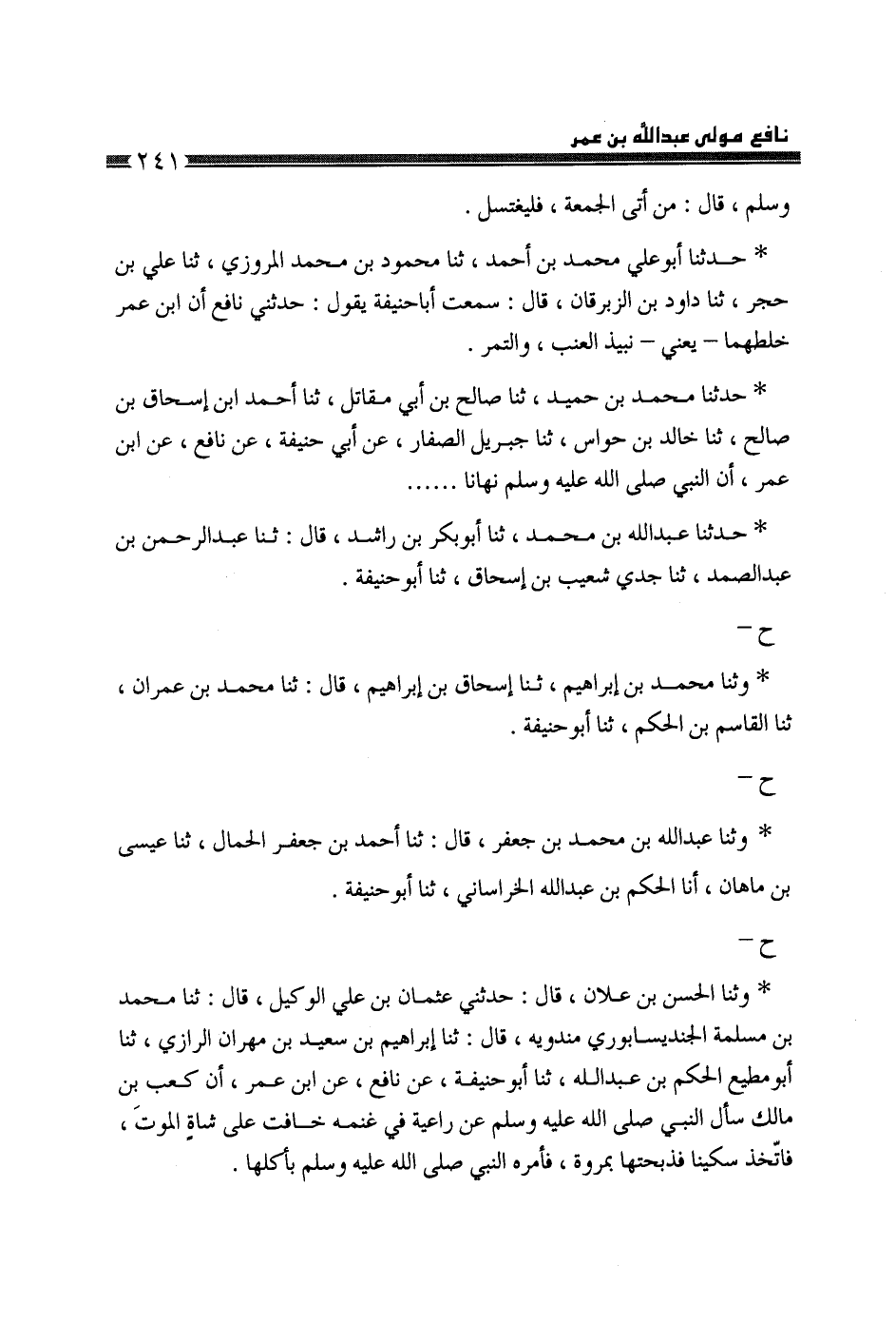 حَدَّثَنَا أَبُو عَلِيٍّ مُحَمَّدُ بْنُ أَحْمَدَ، ثَنَا مَحْمُودُ بْنُ مُحَمَّدٍ الْمَرْوَزِيُّ، ثَنَا عَلِيُّ بْنُ حُجْرٍ، ثَنَا دَاوُدُ بْنُ الزِّبْرِقَانِ، قَالَ: سَمِعْتُ أَبَا حَنِيفَةَ، يَقُولُ: حَدَّثَنِي نَافِعٌ، أَنَّ ابْنَ عُمَرَ، «§خَلَطَهُمَا يَعْنِي نَبِيذَ الْعِنَبِ وَالتَّمْرَ» حَدَّثَنَا مُحَمَّدُ بْنُ حُمَيْدٍ، ثَنَا صَالِحُ بْنُ أَبِي مُقَاتِلٍ، ثَنَا أَحْمَدُ بْنُ إِسْحَاقَ بْنِ صَالِحٍ، ثَنَا خَالِدُ بْنُ حَوَّاسٍ، ثَنَا جِبْرِيلُ الصَّفَّارُ، عَنْ أَبِي حَنِيفَةَ، عَنْ نَافِعٍ، عَنِ ابْنِ عُمَرَ، أَنَّ النَّبِيَّ صَلَّى اللهُ عَلَيْهِ وَسَلَّمَ نَهَانَا.. .
