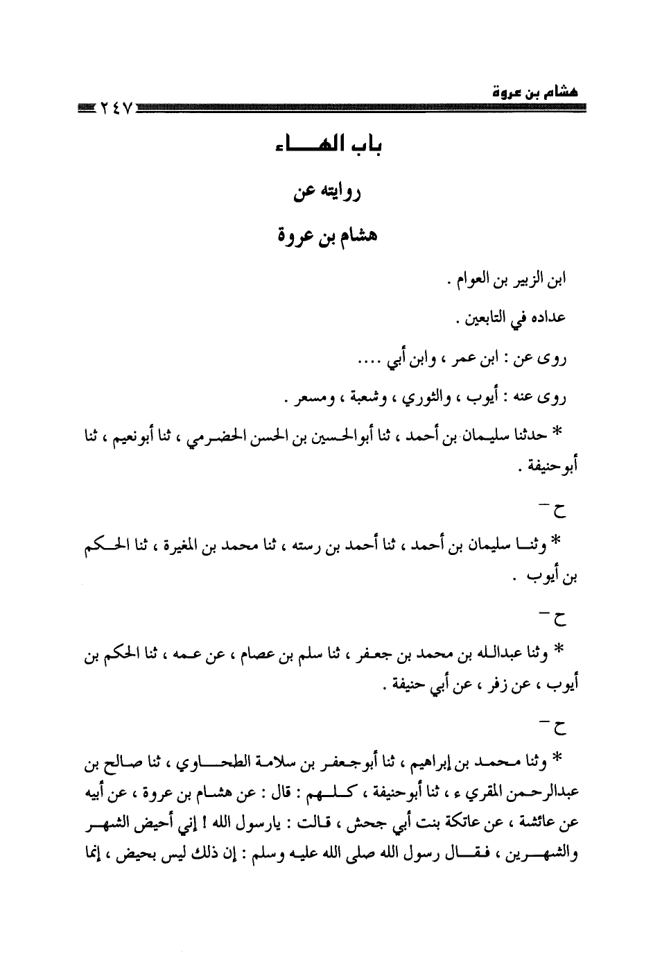 حَدَّثَنَا سُلَيْمَانُ بْنُ أَحْمَدَ، ثَنَا أَبُو الْحُسَيْنِ بْنُ الْحَسَنِ الْحَضْرَمِيُّ، ثَنَا أَبُو نُعَيْمٍ، ثَنَا أَبُو حَنِيفَةَ، ح وَثنا سُلَيْمَانُ بْنُ أَحْمَدَ، ثَنَا أَحْمَدُ بْنُ رُسْتَهْ، ثَنَا مُحَمَّدُ بْنُ الْمُغِيرَةِ، ثَنَا الْحَكَمُ بْنُ أَيُّوبَ، ح وَثنا عَبْدُ اللَّهِ بْنُ مُحَمَّدِ بْنِ جَعْفَرٍ، ثَنَا سَلْمُ بْنُ عِصَامٍ، عَنْ عَمِّهِ، ثَنَا الْحَكَمُ بْنُ أَيُّوبَ، عَنْ زُفَرَ، عَنْ أَبِي حَنِيفَةَ، ح وَثنا مُحَمَّدُ بْنُ إِبْرَاهِيمَ، ثَنَا أَبُو جَعْفَرِ بْنُ سَلَامَةَ الطَّحَاوِيُّ، ثَنَا صَالِحُ بْنُ عَبْدِ الرَّحْمَنِ الْمُقْرِئُ، ثَنَا أَبُو حَنِيفَةَ، كُلُّهُمْ قَالَ عَنْ هِشَامِ بْنِ عُرْوَةَ، عَنْ أَبِيهِ، عَنْ عَائِشَةَ، عَنْ عَاتِكَةَ بِنْتِ أَبِي جَحْشٍ، قَالَتْ: يَا رَسُولَ اللَّهِ، إِنِّي أَحِيضُ الشَّهْرَ وَالشَّهْرَيْنِ، فَقَالَ رَسُولُ اللَّهِ صَلَّى اللهُ عَلَيْهِ وَسَلَّمَ: «إِنَّ ذَلِكَ لَيْسَ بِحَيْضٍ إِنَّمَا -[248]- هَذَا عِرْقٌ.. .. .. . §فَإِذَا أَقْبَلَتِ الْحَيْضَةُ فَدَعِي الصَّلَاةَ، وَإِذَا أُخْبِرْتِ فَاغْتَسِلِي لِطُهْرِكِ، وَتَقْضِي لِكُلِّ صَلَاةٍ» هَذَا لَفْظُ أَبِي عَلِيِّ بْنِ أَبِي الْمُخَارِقِ عَنِ الْحَضْرَمِيِّ رَوَاهُ الْحَسَنُ بْنُ الْفُرَاتِ، وَأَبُو يُوسُفَ وَأَسَدٌ وَأَيُّوبُ، وَسَعِيدُ بْنُ أَبِي الْجَهْمِ، وَمُحَمَّدُ بْنُ مَسْرُوقٍ