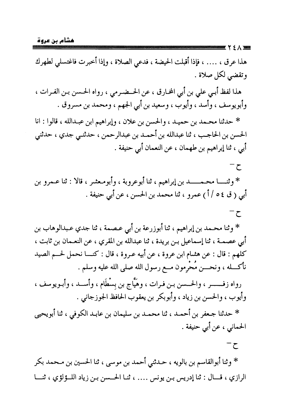 حَدَّثَنَا مُحَمَّدُ بْنُ حُمَيْدٍ، وَالْحَسَنُ بْنُ عَلَّانَ، وَإِبْرَاهِيمُ بْنُ عَبْدِ اللَّهِ، قَالُوا: أَنا الْحَسَنُ بْنُ الْحَاجِبِ، ثَنَا عَبْدُ اللَّهِ بْنُ أَحْمَدَ بْنِ عَبْدِ الرَّحْمَنِ، حَدَّثَنِي جَدِّي، حَدَّثَنِي أَبِي، ثَنَا إِبْرَاهِيمُ بْنُ طَهْمَانَ، عَنِ النُّعْمَانِ أَبِي حَنِيفَةَ ح وَثنا مُحَمَّدُ بْنُ إِبْرَاهِيمَ، ثَنَا أَبُو عَرُوبَةَ وَأَبُو مَعْشَرٍ، قَالَا: ثَنَا عَمْرُو بْنُ أَبِي عَمْرٍو، ثَنَا مُحَمَّدُ بْنُ الْحَسَنِ، عَنْ أَبِي حَنِيفَةَ، ح وَثنا مُحَمَّدُ بْنُ إِبْرَاهِيمَ، ثَنَا أَبُو زُرْعَةَ بْنُ أَبِي عِصْمَةَ، ثَنَا جَدِّي عَبْدُ الْوَهَّابِ بْنُ أَبِي عِصْمَةَ، ثَنَا إِسْمَاعِيلُ بْنُ بُرَيْدَةَ، ثَنَا عَبْدُ اللَّهِ بْنُ الْمُقْرِئِ، عَنِ النُّعْمَانِ بْنِ ثَابِتٍ، كُلُّهُمْ قَالَ: عَنْ هِشَامِ بْنِ عُرْوَةَ، عَنْ أَبِيهِ عُرْوَةَ قَالَ: «§كُنَّا نَحْمِلُ لَحْمَ الصَّيْدِ نَأْكُلُهُ، وَنَحْنُ مُحْرِمُونَ مَعَ رَسُولِ اللَّهِ صَلَّى اللهُ عَلَيْهِ وَسَلَّمَ» ، رَوَاهُ زُفَرُ، وَالْحَسَنُ بْنُ فُرَاتٍ، وَهَيَّاجُ بْنُ بِسْطَامٍ، وَأَسَدٌ، وَأَبُو يُوسُفَ، وَأَيُّوبُ، وَالْحَسَنُ بْنُ زِيَادٍ، وَأَبُو بَكْرِ بْنُ يَعْقُوبَ الْحَافِظُ الْجُوزَجَانِيُّ حَدَّثَنَا جَعْفَرُ بْنُ أَحْمَدَ، ثَنَا مُحَمَّدُ بْنُ سُلَيْمَانَ بْنِ عَابِدٍ الْكُوفِيُّ، ثَنَا أَبُو يَحْيَى الْحِمَّانِيُّ، عَنْ أَبِي حَنِيفَةَ ح وَثنا أَبُو الْقَاسِمِ بْنُ بَالَوَيْهِ، حَدَّثَنِي أَحْمَدُ بْنُ مُوسَى، ثَنَا الْحُسَيْنُ بْنُ مُحَمَّدِ بْنِ بَكْرٍ الرَّازِيُّ، قَالَ: ثَنَا إِدْرِيسُ بْنُ يُونُسَ، ثَنَا الْحَسَنُ بْنُ زِيَادٍ اللُّؤْلُؤِيُّ، ثَنَا