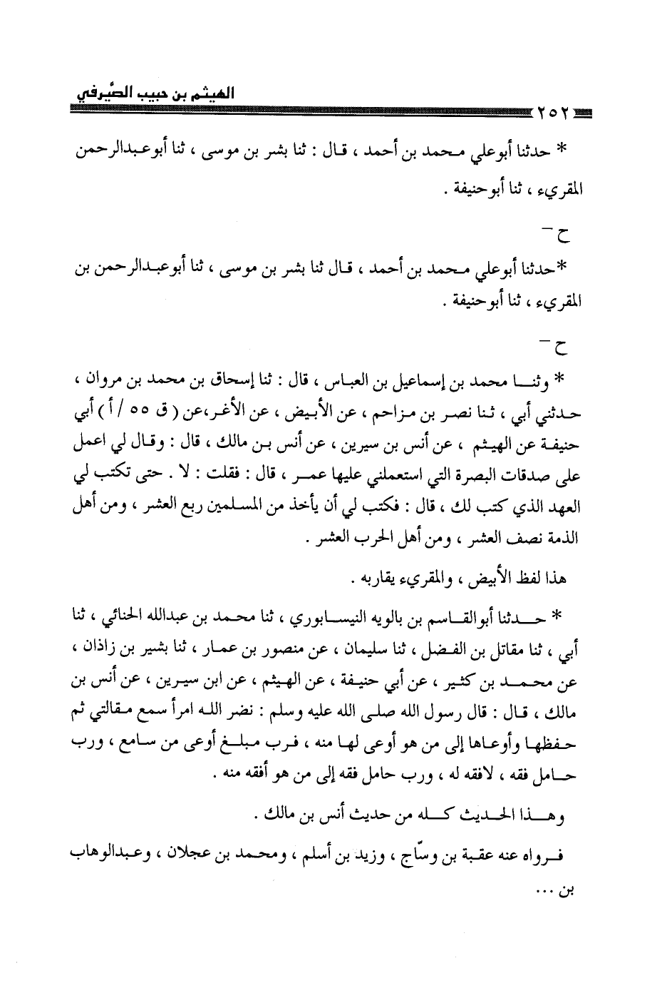 حَدَّثَنَا أَبُو عَلِيٍّ مُحَمَّدُ بْنُ أَحْمَدَ قَالَ: ثَنَا بِشْرُ بْنُ مُوسَى، ثَنَا أَبُو عَبْدِ الرَّحْمَنِ الْمُقْرِئُ، ثَنَا أَبُو حَنِيفَةَ، ح حَدَّثَنَا أَبُو عَلِيٍّ مُحَمَّدُ بْنُ أَحْمَدَ قَالَ: ثَنَا بِشْرُ بْنُ مُوسَى، ثَنَا أَبُو عَبْدِ الرَّحْمَنِ بْنُ الْمُقْرِئِ، ثَنَا أَبُو حَنِيفَةَ، ح وَثنا مُحَمَّدُ بْنُ إِسْمَاعِيلَ بْنِ الْعَبَّاسِ، قَالَ: ثَنَا إِسْحَاقُ بْنُ مُحَمَّدِ بْنِ مَرْوَانَ، حَدَّثَنِي أَبِي، ثَنَا نَصْرُ بْنُ مُزَاحِمٍ، عَنِ الْأَبْيَضِ بْنِ الْأَغَرِّ، عَنْ أَبِي حَنِيفَةَ، عَنِ الْهَيْثَمِ، عَنْ أَنَسِ بْنِ سِيرِينَ، عَنْ أَنَسِ بْنِ مَالِكٍ، قَالَ: وَقَالَ لِي: اعْمَلْ عَلَى صَدَقَاتِ الْبَصْرَةِ الَّتِي اسْتَعْمَلَنِي عَلَيْهَا عُمَرُ قَالَ: فَقُلْتُ: لَا حَتَّى تَكْتُبَ لِيَ الْعَهْدَ الَّذِي كُتِبَ لَكَ، قَالَ: «§فَكَتَبَ لِي أَنْ يَأْخُذَ مِنَ الْمُسْلِمِينَ رُبْعَ الْعُشْرِ وَمَنْ أَهْلِ الذِّمَّةِ نِصْفَ الْعُشْرِ، وَمَنْ أَهْلِ الْحَرْبِ الْعُشْرَ» ، هَذَا لَفْظُ الْأَبْيَضِ، وَالْمُقْرِئُ يُقَارِبُهُ