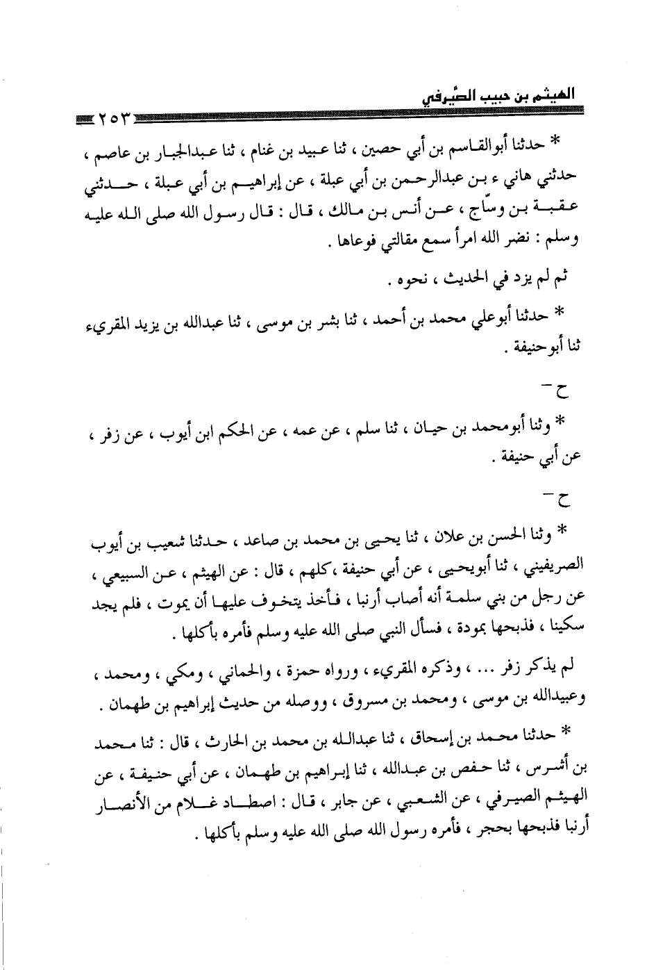حَدَّثَنَا أَبُو عَلِيٍّ مُحَمَّدُ بْنُ أَحْمَدَ، ثَنَا بِشْرُ بْنُ مُوسَى، ثَنَا عَبْدُ اللَّهِ بْنُ يَزِيدَ الْمُقْرِئُ، ثَنَا أَبُو حَنِيفَةَ ح، وَثنا أَبُو مُحَمَّدِ بْنُ حَيَّانَ، ثَنَا سَلْمٌ عَنْ عَمِّهِ عَنِ الْحَكَمِ بْنِ أَيُّوبَ، عَنْ زُفَرَ، عَنْ أَبِي حَنِيفَةَ ح وَثنا الْحَسَنُ بْنُ عَلَّانَ، ثَنَا يَحْيَى بْنُ مُحَمَّدِ بْنِ صَاعِدٍ، حَدَّثَنَا شُعَيْبُ بْنُ أَيُّوبَ الصَّرِيفِينِيُّ، ثَنَا أَبُو يَحْيَى، عَنْ أَبِي حَنِيفَةَ، كُلُّهُمْ قَالَ: عَنِ الْهَيْثَمِ عَنِ الشَّعْبِيِّ عَنْ رَجُلٍ مِنْ بَنِي سَلَمَةَ أَنَّهُ §أَصَابَ أَرْنَبًا فَأَخَذَ يَتَخَوَّفُ عَلَيْهَا أَنْ يَمُوتَ، فَلَمْ يَجِدْ سِكِّينًا فَذَبَحَهَا بِمَرْوَةٍ فَسَأَلَ النَّبِيَّ صَلَّى اللهُ عَلَيْهِ وَسَلَّمَ فَأَمَرَهُ، بِأَكْلِهَا " لَمْ يَذْكُرْ زُفَرُ.. .. .. ..، وَذَكَرَهُ الْمُقْرِئُ، وَرَوَاهُ حَمْزَةُ وَالْحِمَّانِيُّ، وَمَكِّيٌّ وَمُحَمَّدٌ وَعُبَيْدُ اللَّهِ بْنُ مُوسَى وَمُحَمَّدُ بْنُ مَسْرُوقٍ، وَوَصَلَهُ مِنْ حَدِيثِ إِبْرَاهِيمَ بْنِ طَهْمَانَ