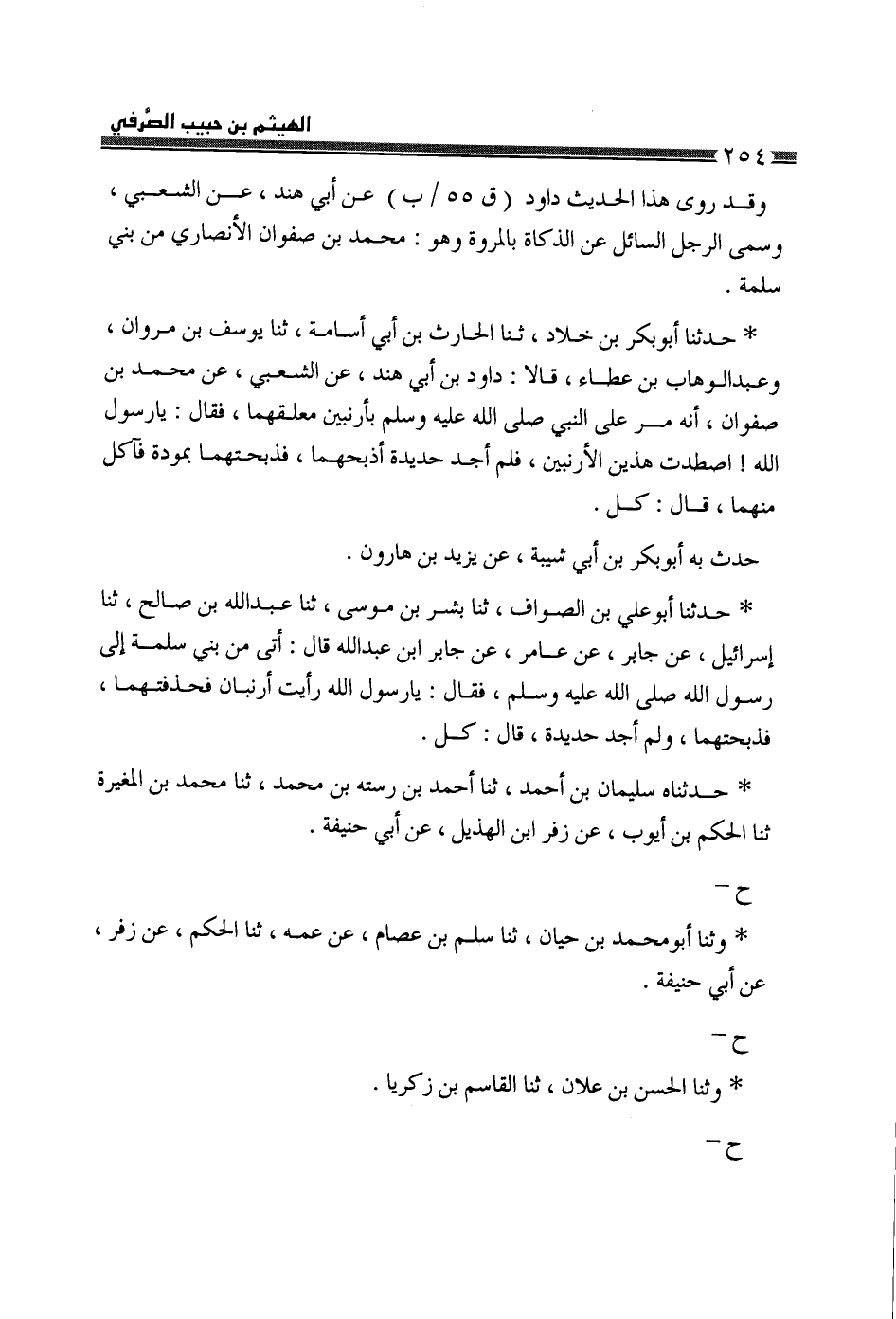 حَدَّثَنَا أَبُو بَكْرِ بْنُ خَلَّادٍ، ثَنَا الْحَارِثُ بْنُ أَبِي أُسَامَةَ، ثَنَا يُوسُفُ بْنُ مَرْوَانَ، وَعَبْدُ الْوَهَّابِ بْنُ عَطَاءٍ، قَالَا: دَاوُدُ بْنُ أَبِي هِنْدٍ عَنِ الشَّعْبِيِّ، عَنْ مُحَمَّدِ بْنِ صَفْوَانَ، أَنَّهُ مَرَّ عَلَى النَّبِيِّ صَلَّى اللهُ عَلَيْهِ وَسَلَّمَ بِأَرْنَبَيْنِ مُعَلِّقَهُمَا، فَقَالَ: يَا رَسُولَ اللَّهِ اصْطَدْتُ هَذَيْنِ الْأَرْنَبَيْنِ فَلَمْ أَجِدْ حَدِيدَةً أَذْبَحُهُمَا، فَذَبَحْتُهُمَا بِمَرْوَةٍ فَآكُلُ مِنْهُمَا؟ قَالَ: «§كُلْ» حَدَّثَ بِهِ أَبُو بَكْرِ بْنُ أَبِي شَيْبَةَ، عَنْ يَزِيدَ بْنِ هَارُونَ