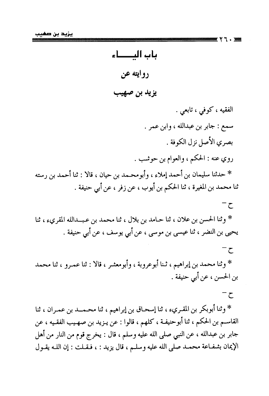 حَدَّثَنَا سُلَيْمَانُ بْنُ أَحْمَدَ، إِمْلَاءً وَأَبُو مُحَمَّدِ بْنُ حَيَّانَ، قَالَا: ثَنَا أَحْمَدُ بْنُ رُسْتَهْ، ثَنَا مُحَمَّدُ بْنُ الْمُغِيرَةِ، ثَنَا الْحَكَمُ بْنُ أَيُّوبَ، عَنْ زُفَرَ، عَنْ أَبِي حَنِيفَةَ، ح وَثنا الْحَسَنُ بْنُ عَلَّانَ، ثَنَا حَامِدُ بْنُ بِلَالٍ، ثَنَا مُحَمَّدُ بْنُ عَبْدِ اللَّهِ الْمُقْرِئُ، ثَنَا يَحْيَى بْنُ النَّضْرِ، ثَنَا عِيسَى بْنُ مُوسَى، عَنْ أَبِي يُوسُفَ، عَنْ أَبِي حَنِيفَةَ، ح وَثنا مُحَمَّدُ بْنُ إِبْرَاهِيمَ، ثَنَا أَبُو عَرُوبَةَ، وَأَبُو مَعْشَرٍ، قَالَا: ثَنَا عَمْرٌو، ثَنَا مُحَمَّدُ بْنُ الْحَسَنِ، عَنْ أَبِي حَنِيفَةَ، ح وَثنا أَبُو بَكْرِ بْنُ الْمُقْرِئِ، ثَنَا إِسْحَاقُ بْنُ إِبْرَاهِيمَ، ثَنَا مُحَمَّدُ بْنُ عِمْرَانَ، ثَنَا الْقَاسِمُ بْنُ الْحَكَمِ، ثَنَا أَبُو حَنِيفَةَ، كُلُّهُمْ قَالُوا عَنْ يَزِيدَ بْنِ صُهَيْبٍ الْفَقِيهِ، عَنْ جَابِرِ بْنِ عَبْدِ اللَّهِ، عَنِ النَّبِيِّ صَلَّى اللهُ عَلَيْهِ وَسَلَّمَ قَالَ: «§يَخْرُجُ قَوْمٌ مِنَ النَّارِ مِنْ أَهْلِ الْإِيمَانِ بِشَفَاعَةِ مُحَمَّدٍ صَلَّى اللهُ عَلَيْهِ وَسَلَّمَ» ، قَالَ يَزِيدُ: فَقُلْتُ: إِنَّ اللَّهَ يَقُولُ -[261]- {وَمَا هُمْ بِخَارِجِينَ مِنْهَا} [الْمَائِدَة: 37] ، قَالَ جَابِرٌ: اقْرَأْ مَا قَبْلَهَا: {إِنَّ الَّذِينَ كَفَرُوا} [الْمَائِدَة: 36] ، إِنَّمَا هِيَ فِي الْكُفَّارِ هَذَا، لَفْظُ زُفَرَ وَأَبُو يُوسُفَ مِثْلَهُ، وَقَالَ الْقَاسِمُ: يُعَذِّبُ اللَّهُ قَوْمًا مِنْ أَهْلِ الْإِيمَانِ ثُمَّ يُخْرِجُهُمْ بِشَفَاعَةِ مُحَمَّدٍ صَلَّى اللهُ عَلَيْهِ وَسَلَّمَ، الْبَاقِي مِثْلَهُ، رَوَاهُ الْحِمَّانِيُّ وَالنَّضْرُ بْنُ مُحَمَّدٍ وَأَسَدُ بْنُ عَمْرٍو، وَعَبْدُ اللَّهِ بْنُ الْمُبَارَكِ، وَحَمْزَةُ الزَّيَّاتُ وَالْمُقْرِئُ، وَأَبُو سَعْدٍ الصَّاغَانِيُّ، وَالْحَسَنُ بْنُ الْفُرَاتِ، وَسَعِيدُ بْنُ أَبِي الْجَهْمِ، وَأَيُّوبُ بْنُ هَانِئٍ، وَالْقَاسِمُ بْنُ الْحَكَمِ، وَالْحَسَنُ بْنُ زِيَادٍ، وَمُحَمَّدُ بْنُ مَسْرُوقٍ وَمُحَمَّدُ بْنُ الْحَسَنِ، وَحَمَّادُ بْنُ أَبِي حَنِيفَةَ