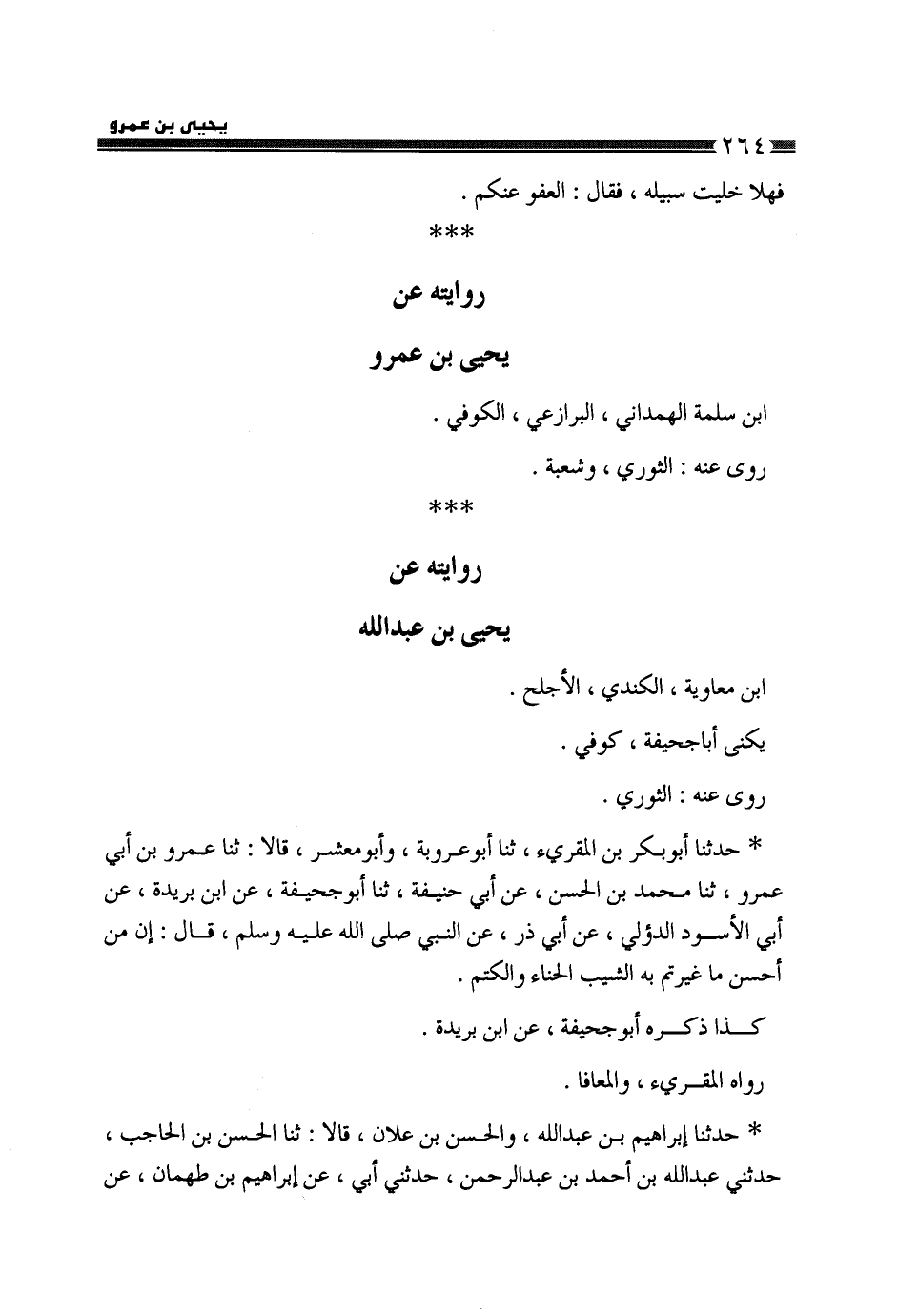 §رِوَايَتُهُ عَنْ يَحْيَى بْنِ عَمْرِو بْنِ سَلَمَةَ الْهَمْدَانِيِّ الْبَرَازِعِيِّ الْكُوفِيِّ رَوَى عَنْهُ الثَّوْرِيُّ وَشُعْبَةُ