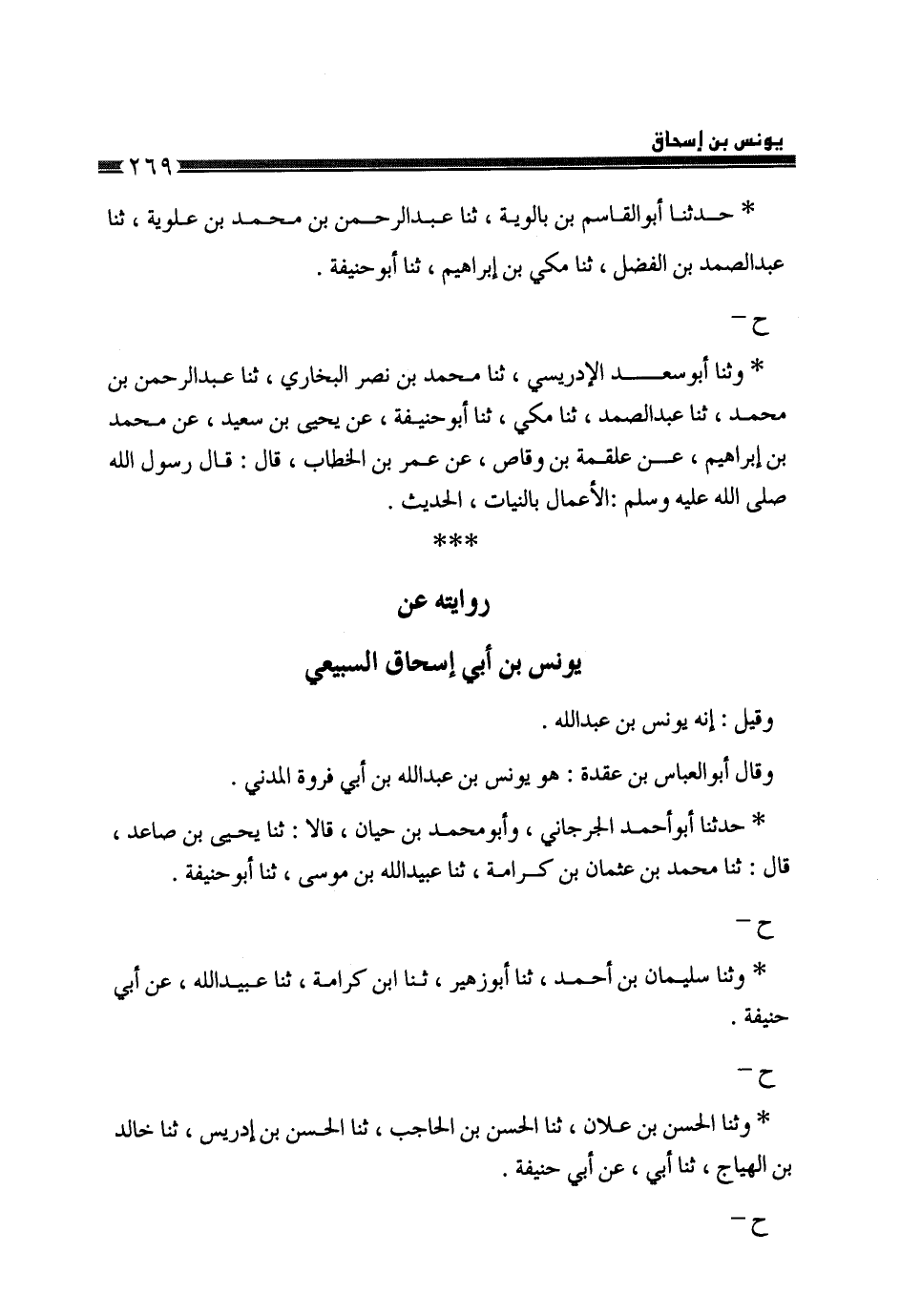 حَدَّثَنَا أَبُو الْقَاسِمِ بْنُ بَالَوَيْهِ، ثَنَا عَبْدُ الرَّحْمَنِ بْنُ مُحَمَّدِ بْنِ عَلَّوَيْهِ، ثَنَا عَبْدُ الصَّمَدِ بْنُ الْفَضْلِ، ثَنَا مَكِّيُّ بْنُ إِبْرَاهِيمَ، ثَنَا أَبُو حَنِيفَةَ، ح وَثنا أَبُو سَعْدٍ الْإِدْرِيسِيُّ، ثَنَا مُحَمَّدُ بْنُ نَصْرٍ الْبُخَارِيُّ، ثَنَا عَبْدُ الرَّحْمَنِ بْنُ مُحَمَّدٍ، ثَنَا عَبْدُ الصَّمَدِ، ثَنَا مَكِّيٌّ، ثَنَا أَبُو حَنِيفَةَ، عَنْ يَحْيَى بْنِ سَعِيدٍ، عَنْ مُحَمَّدِ بْنِ إِبْرَاهِيمَ، عَنْ عَلْقَمَةَ بْنِ وَقَّاصٍ، عَنْ عُمَرَ بْنِ الْخَطَّابِ، قَالَ: قَالَ رَسُولُ اللَّهِ صَلَّى اللهُ عَلَيْهِ وَسَلَّمَ: " §الْأَعْمَالُ بِالنِّيَّاتِ.. .. الْحَدِيثَ