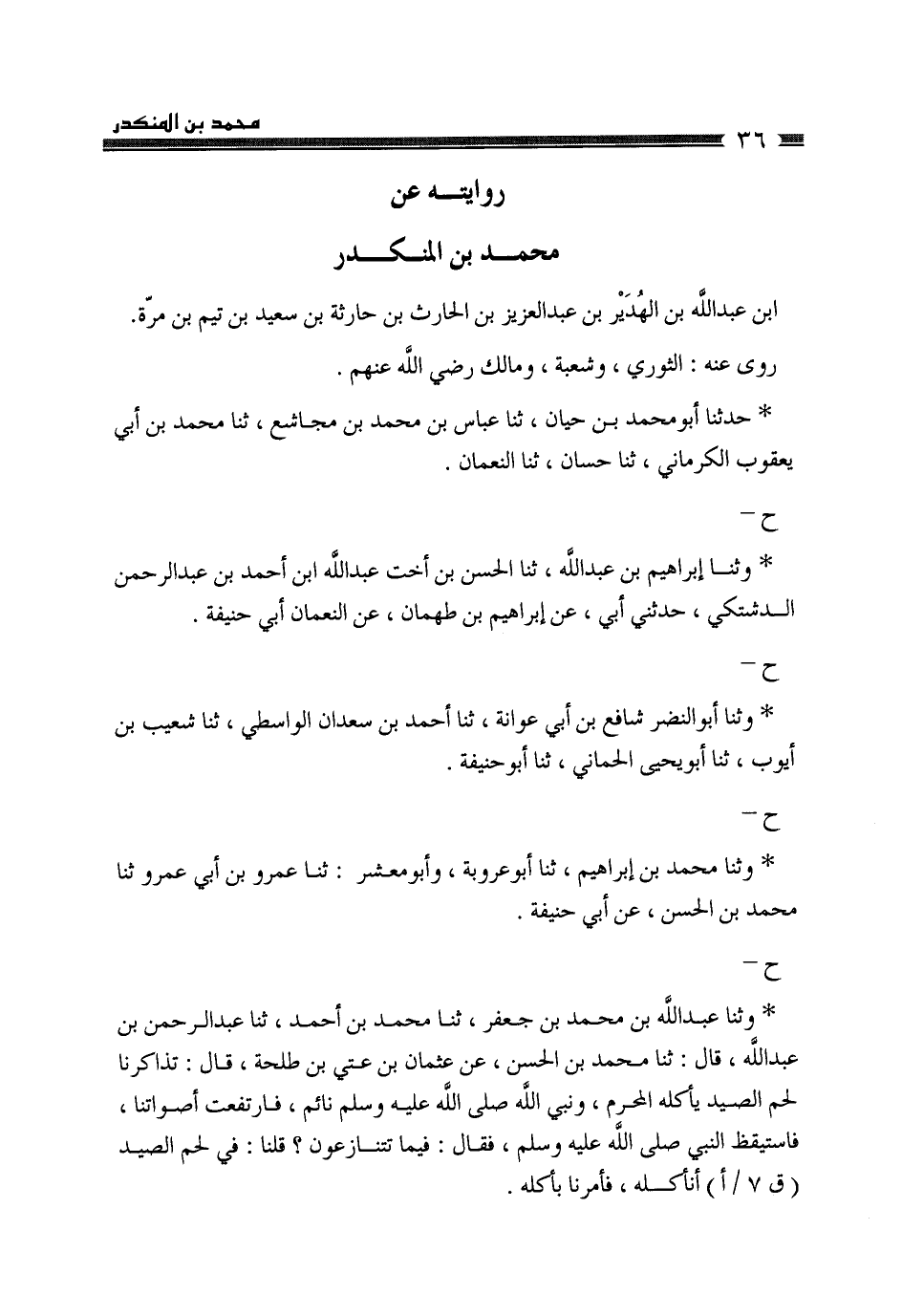 §رِوَايَتُهُ عَنْ مُحَمَّدِ بْنِ الْمُنْكَدِرِ بْنِ عَبْدِ اللَّهِ بْنِ الْهُدَيْرِ بْنِ عَبْدِ الْعَزِيزِ بْنِ الْحَارِثِ بْنِ حَارِثَةَ بْنِ سَعِيدِ بْنِ تَيْمِ بْنِ مُرَّةَ رَوَى عَنْهُ الثَّوْرِيُّ، وَشُعْبَةُ، وَمَالِكٌ، رَضِيَ اللَّهُ عَنْهُمْ
