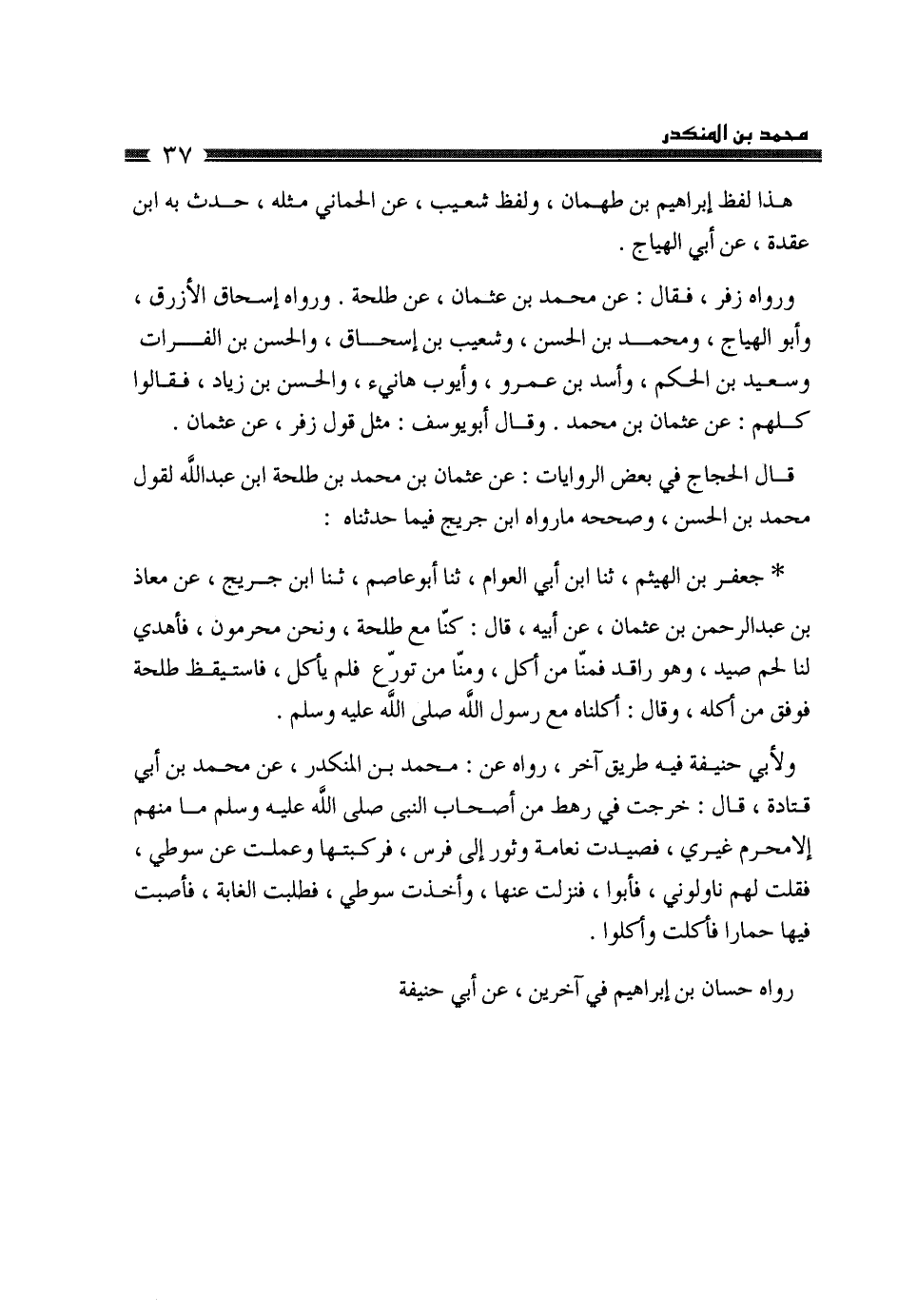 هَذَا لَفْظُ إِبْرَاهِيمَ بْنِ طَهْمَانَ، وَلَفْظُ شُعَيْبٍ عَنِ الْحِمَّانِيِّ مِثْلُهُ. حَدَّثَ بِهِ ابْنُ عُقْدَةَ، عَنْ أَبِي الْهَيَّاجِ وَرَوَاهُ زُفَرُ فَقَالَ: عَنْ مُحَمَّدِ بْنِ عُثْمَانَ، عَنْ طَلْحَةَ وَرَوَاهُ إِسْحَاقُ الْأَزْرَقُ، وَأَبُو الْهَيَّاجِ، وَمُحَمَّدُ بْنُ الْحَسَنِ، وَشُعَيْبُ بْنُ إِسْحَاقَ، وَالْحَسَنُ بْنُ الْفُرَاتِ، وَسَعِيدُ بْنُ الْحَكَمِ، وَأَسَدُ بْنُ عَمْرٍو، وَأَيُّوبُ بْنُ هَانِئٍ، وَالْحَسَنُ بْنُ زِيَادٍ، فَقَالُوا كُلُّهُمْ: عَنْ عُثْمَانَ بْنِ مُحَمَّدٍ، وَقَالَ أَبُو يُوسُفَ: مِثْلَ قَوْلِ زُفَرَ، عَنْ عُثْمَانَ قَالَ الْحَجَّاجُ فِي بَعْضِ الرِّوَايَاتِ، عَنْ عُثْمَانَ بْنِ مُحَمَّدِ بْنِ طَلْحَةَ بْنِ عَبْدِ اللَّهِ لِقَوْلِ مُحَمَّدِ بْنِ الْحَسَنِ، وَصَحَّحَهُ مَا رَوَاهُ ابْنُ جُرَيْجٍ