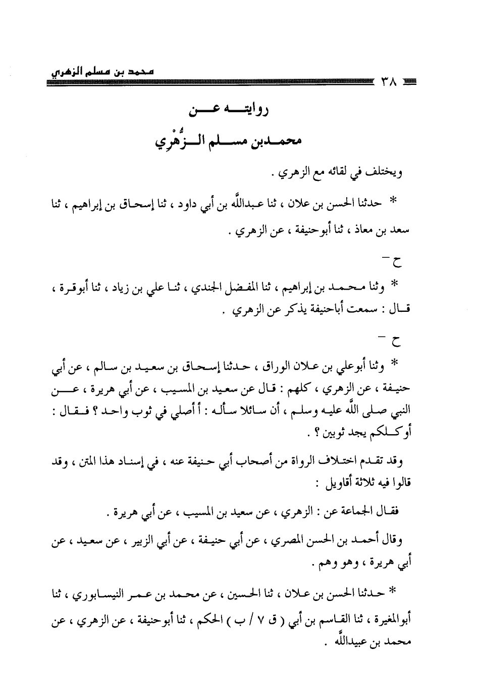 حَدَّثَنَا الْحَسَنُ بْنُ عَلَّانَ، ثَنَا عَبْدُ اللَّهِ بْنُ أَبِي دَاوُدَ، ثَنَا إِسْحَاقُ بْنُ إِبْرَاهِيمَ، ثَنَا سَعْدُ بْنُ مُعَاذٍ، ثَنَا أَبُو حَنِيفَةَ، عَنِ الزُّهْرِيِّ، ح وَثنا مُحَمَّدُ بْنُ إِبْرَاهِيمَ، ثَنَا الْمُفَضَّلُ الْجَنَدِيُّ، ثَنَا عَلِيُّ بْنُ زِيَادٍ، ثَنَا أَبُو قُرَّةَ، قَالَ: سَمِعْتُ أَبَا حَنِيفَةَ، يَذْكُرُ، عَنِ الزُّهْرِيِّ، ح وثنا أَبُو عَلِيِّ بْنُ عَلَّانَ الْوَرَّاقُ، حَدَّثَنَا إِسْحَاقُ بْنُ سَعِيدِ بْنِ سَالِمٍ، عَنْ أَبِي حَنِيفَةَ، عَنِ الزُّهْرِيِّ، كُلُّهُمْ قَالَ: عَنْ سَعِيدِ بْنِ الْمُسَيِّبِ، عَنْ أَبِي هُرَيْرَةَ، عَنِ النَّبِيِّ صَلَّى اللهُ عَلَيْهِ وَسَلَّمَ، أَنَّ سَائِلًا سَأَلَهُ: أَأُصَلِّي فِي ثَوْبٍ وَاحِدٍ؟ فَقَالَ: «§أَوَكُلُّكُمْ يَجِدُ ثَوْبَيْنِ؟» وَقَدْ تَقَدَّمَ اخْتِلَافُ الرُّوَاةِ مِنْ أَصْحَابِ أَبِي حَنِيفَةَ عَنْهُ، فِي إِسْنَادِ هَذَا الْمَتْنِ، وَقَدْ قَالُوا فِيهِ ثَلَاثَةَ أَقَاوِيلَ: فَقَالَ الْجَمَاعَةُ: عَنِ الزُّهْرِيِّ، عَنْ سَعِيدِ بْنِ الْمُسَيِّبِ، عَنْ أَبِي هُرَيْرَةَ وَقَالَ أَحْمَدُ بْنُ الْحَسَنِ الْمِصْرِيُّ: عَنْ أَبِي حَنِيفَةَ، عَنْ أَبِي الزُّبَيْرِ، عَنْ سَعِيدٍ، عَنْ أَبِي هُرَيْرَةَ، وَهُوَ وَهْمٌ
