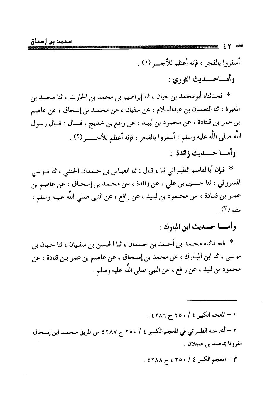 وَأَمَّا حَدِيثُ الثَّوْرِيِّ: فَحَدَّثَنَاهُ أَبُو مُحَمَّدِ بْنُ حَيَّانَ، ثَنَا إِبْرَاهِيمُ بْنُ مُحَمَّدِ بْنِ الْحَارِثِ، ثَنَا مُحَمَّدُ بْنُ الْمُغِيرَةِ، ثَنَا النُّعْمَانُ بْنُ عَبْدِ السَّلَامِ، عَنْ سُفْيَانَ، عَنْ مُحَمَّدِ بْنِ إِسْحَاقَ، عَنْ عَاصِمِ بْنِ عُمَرَ بْنِ قَتَادَةَ، عَنْ مَحْمُودِ بْنِ لَبِيدٍ، عَنْ رَافِعِ بْنِ خَدِيجٍ قَالَ: قَالَ رَسُولُ اللَّهِ صَلَّى اللهُ عَلَيْهِ وَسَلَّمَ: «§أَسْفِرُوا بِالْفَجْرِ؛ فَإِنَّهُ أَعْظَمُ لِلْأَجْرِ» وَأَمَّا حَدِيثُ زَائِدَةَ: فَإِنَّ أَبَا الْقَاسِمِ الطَّبَرَانِيَّ ثَنَا قَالَ: ثَنَا الْعَبَّاسُ بْنُ حَمْدَانَ الْحَنَفِيُّ، ثَنَا مُوسَى الْمَسْرُوقِيُّ، ثَنَا حُسَيْنُ بْنُ عَلِيٍّ، عَنْ زَائِدَةَ، عَنْ مُحَمَّدِ بْنِ إِسْحَاقَ، عَنْ عَاصِمِ بْنِ عُمَرَ بْنِ قَتَادَةَ، عَنْ مَحْمُودِ بْنِ لَبِيدٍ، عَنْ رَافِعٍ، عَنِ النَّبِيِّ صَلَّى اللهُ عَلَيْهِ وَسَلَّمَ مِثْلَهُ وَأَمَّا حَدِيثُ ابْنِ الْمُبَارَكِ: فَحَدَّثَنَاهُ مُحَمَّدُ بْنُ أَحْمَدَ بْنِ حَمْدَانَ، ثَنَا الْحَسَنُ بْنُ سُفْيَانَ، ثَنَا حَبَّانُ بْنُ مُوسَى، ثَنَا ابْنُ الْمُبَارَكِ، عَنْ مُحَمَّدِ بْنِ إِسْحَاقَ، عَنْ عَاصِمِ بْنِ عُمَرَ بْنِ قَتَادَةَ، عَنْ مَحْمُودِ بْنِ لَبِيدٍ، عَنْ رَافِعٍ، عَنِ النَّبِيِّ صَلَّى اللهُ عَلَيْهِ وَسَلَّمَ، -[43]- وَأَمَّا حَدِيثُ ابْنِ شِهَابٍ: فَإِنَّ حَبِيبَ بْنَ الْحَسَنِ، ثَنَا يُوسُفُ الْقَاضِي، ثَنَا (.. ..) أنبأ ابْنُ شِهَابٍ، عَنْ مُحَمَّدِ بْنِ إِسْحَاقَ، عَنْ عَاصِمِ بْنِ عُمَرَ، عَنْ مَحْمُودِ بْنِ لَبِيدٍ، عَنْ رَافِعِ بْنِ خَدِيجٍ،: سَمِعْتُ النَّبِيَّ صَلَّى اللهُ عَلَيْهِ وَسَلَّمَ يَقُولُ مِثْلَهُ، وَأَمَّا حَدِيثُ يَزِيدَ بْنِ زُرَيْعٍ: فَحَدَّثَنَاهُ سُلَيْمَانُ، ثَنَا مُعَاذُ بْنُ الْمُثَنَّى، ثَنَا مُسَدَّدٌ، ثَنَا يَزِيدُ بْنُ زُرَيْعٍ، عَنْ مُحَمَّدِ بْنِ إِسْحَاقَ، عَنْ عَاصِمِ بْنِ عُمَرَ، عَنْ مَحْمُودِ بْنِ لَبِيدٍ، عَنْ رَافِعٍ عَنِ النَّبِيِّ صَلَّى اللهُ عَلَيْهِ وَسَلَّمَ، وَأَمَّا حَدِيثُ جَرِيرٍ، وَعِيسَى: فَإِنَّ أَبَا عَمْرِو بْنَ حَمْدَانَ الْحِيرِيَّ قَالَ: ثَنَا الْحَسَنُ بْنُ سُفْيَانَ، ثَنَا إِسْحَاقُ الْحَنْظَلِيُّ، أنبأ جَرِيرٌ، وَعِيسَى بْنُ يُونُسَ، عَنْ مُحَمَّدِ بْنِ إِسْحَاقَ، عَنْ عَاصِمٍ، مِثْلَهُ