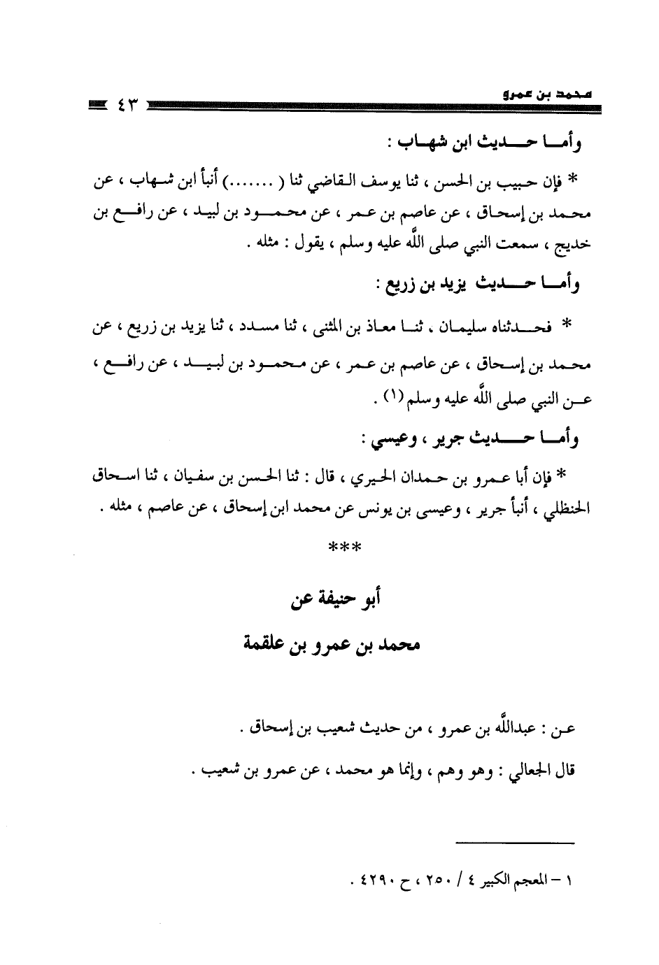 §أَبُو حَنِيفَةَ عَنْ مُحَمَّدِ بْنِ عَمْرِو بْنِ عَلْقَمَةَ، عَنْ عَبْدِ اللَّهِ بْنِ عَمْرٍو، مِنْ حَدِيثِ شُعَيْبِ بْنِ إِسْحَاقَ قَالَ الْجَعَّالِيُّ: وَهُوَ وَهْمٌ، وَإِنَّمَا هُوَ مُحَمَّدٌ، عَنْ عَمْرِو بْنِ شُعَيْبٍ