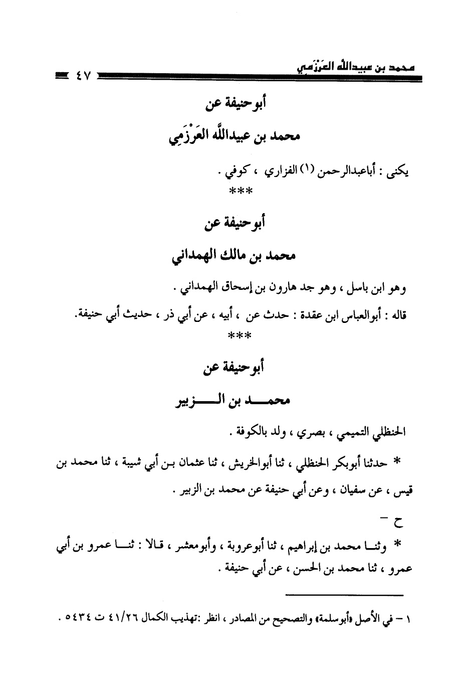 §أَبُو حَنِيفَةَ عَنْ مُحَمَّدِ بْنِ عُبَيْدِ اللَّهِ الْعَرْزَمِيِّ يُكْنَى أَبَا عَبْدِ الرَّحْمَنِ الْفَزَارِيَّ، كُوفِيٌّ