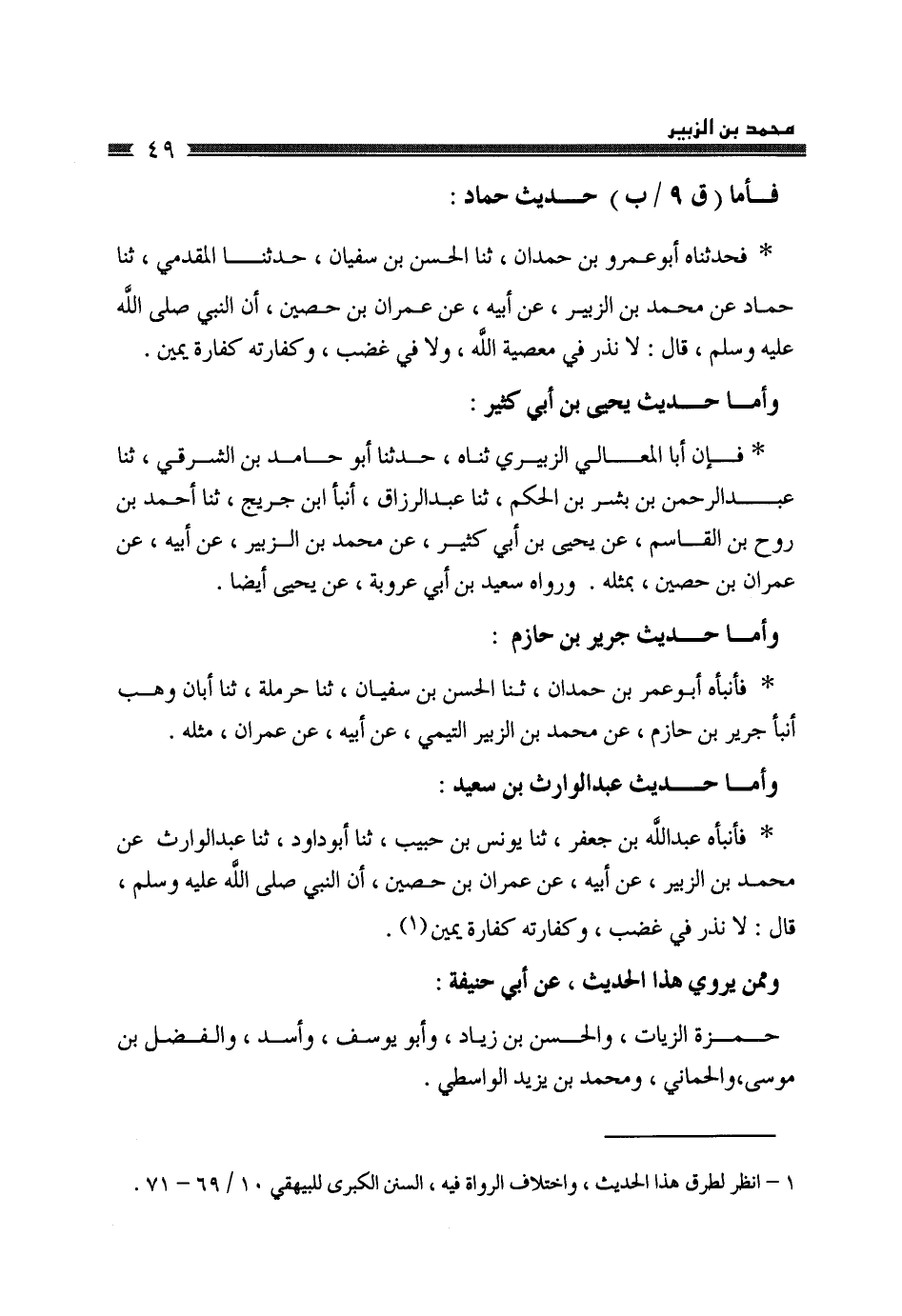 فَأَمَّا حَدِيثُ حَمَّادٍ: فَحَدَّثَنَاهُ أَبُو عَمْرِو بْنُ حَمْدَانَ، ثَنَا الْحَسَنُ بْنُ سُفْيَانَ، حَدَّثَنَا الْمُقَدَّمِيُّ، ثَنَا حَمَّادٌ، عَنْ مُحَمَّدِ بْنِ الزُّبَيْرِ، عَنْ أَبِيهِ، عَنْ عِمْرَانَ بْنِ حُصَيْنٍ، أَنَّ النَّبِيَّ صَلَّى اللهُ عَلَيْهِ وَسَلَّمَ قَالَ: «§لَا نَذْرَ فِي مَعْصِيَةِ اللَّهِ، وَلَا فِي غَضَبٍ، وَكَفَّارَتُهُ كَفَّارَةُ يَمِينٍ» وَأَمَّا حَدِيثُ يَحْيَى بْنِ أَبِي كَثِيرٍ: فَإِنَّ أَبَا الْمَعَالِي الزُّبَيْرِيَّ ثناه، حَدَّثَنَا أَبُو حَامِدِ بْنُ الشَّرْقِيِّ، ثَنَا عَبْدُ الرَّحْمَنِ بْنُ بِشْرِ بْنِ الْحَكَمِ، ثَنَا عَبْدُ الرَّزَّاقِ، أنبأ ابْنُ جُرَيْجٍ، ثَنَا أَحْمَدُ بْنُ رَوْحِ بْنِ الْقَاسِمِ، عَنْ يَحْيَى بْنِ أَبِي كَثِيرٍ، عَنْ مُحَمَّدِ بْنِ الزُّبَيْرِ، عَنْ أَبِيهِ، عَنْ عِمْرَانَ بْنِ حُصَيْنٍ بِمِثْلِهِ، وَرَوَاهُ سَعِيدُ بْنُ أَبِي عَرُوبَةَ عَنْ يَحْيَى أَيْضًا، وَأَمَّا حَدِيثُ جَرِيرِ بْنِ حَازِمٍ: فَأَنْبَأَهُ أَبُو عَمْرِو بْنُ حَمْدَانَ، ثَنَا الْحَسَنُ بْنُ سُفْيَانَ، ثَنَا حَرْمَلَةُ، ثَنَا أَبَانُ بْنُ وَهْبٍ، أنبأ جَرِيرُ بْنُ حَازِمٍ، عَنْ مُحَمَّدِ بْنِ الزُّبَيْرِ التَّمِيمِيِّ، عَنْ أَبِيهِ، عَنْ عِمْرَانَ، مِثْلَهُ
