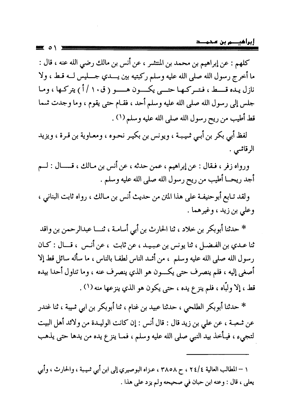 حَدَّثَنَا أَبُو بَكْرِ بْنُ خَلَّادٍ، ثَنَا الْحَارِثُ بْنُ أَبِي أُسَامَةَ، ثَنَا عَبْدُ الرَّحْمَنِ بْنُ وَاقِدٍ، ثَنَا عَدِيُّ بْنُ الْفَضْلِ، ثَنَا يُونُسُ بْنُ عُبَيْدٍ، عَنْ ثَابِتٍ، عَنْ أَنَسٍ، قَالَ: «§كَانَ رَسُولُ اللَّهِ صَلَّى اللهُ عَلَيْهِ وَسَلَّمَ مِنْ أَشَدِّ النَّاسِ لُطْفًا بِالنَّاسِ، مَا سَأَلَهُ سَائِلٌ قَطُّ إِلَّا أَصْغَى إِلَيْهِ، فَلَمْ يَنْصَرِفْ حَتَّى يَكُونَ هُوَ الَّذِي يَنْصَرِفُ عَنْهُ، وَمَا تَنَاوَلَ أَحَدٌ بِيَدِهِ قَطُّ إِلَّا وَلَبَّاهُ، فَلَمْ يَنْزِعْ يَدَهُ حَتَّى يَكُونَ هُوَ الَّذِي يَنْزِعُهَا مِنْهُ»