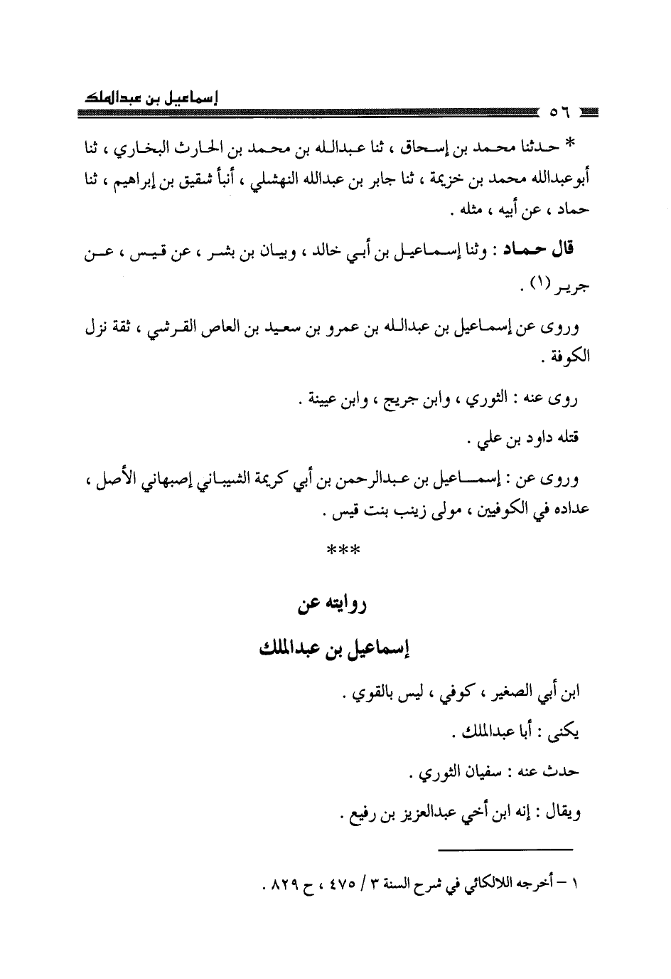 §رِوَايَتُهُ عَنْ إِسْمَاعِيلَ بْنِ عَبْدِ الْمَلِكِ بْنِ أَبِي الصَّغِيرِ كُوفِيٌّ، لَيْسَ بِالْقَوِيِّ يُكْنَى أَبَا عَبْدِ الْمَلِكِ حَدَّثَ عَنْهُ سُفْيَانُ الثَّوْرِيُّ، وَيُقَالُ: إِنَّهُ ابْنُ أَخِي عَبْدِ الْعَزِيزِ بْنِ رُفَيْعٍ