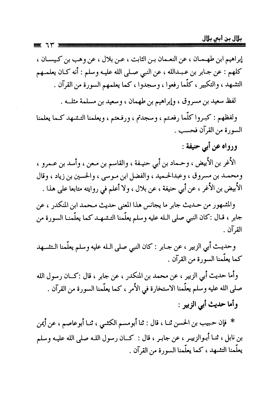 وَحَدِيثُ أَبِي الزُّبَيْرِ، عَنْ جَابِرٍ، «§كَانَ النَّبِيُّ صَلَّى اللهُ عَلَيْهِ وَسَلَّمَ يُعَلِّمُنَا التَّشَهُّدَ كَمَا يُعَلِّمُنَا السُّورَةَ مِنَ الْقُرْآنِ»