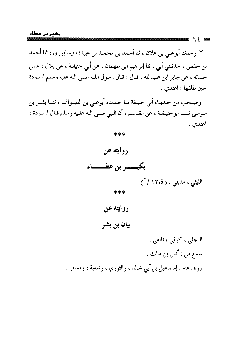 §رِوَايَتُهُ عَنْ بَيَانِ بْنِ بِشْرٍ الْبَجَلِيِّ كُوفِيٌّ، تَابِعِيٌّ، سَمِعَ مِنْ أَنَسِ بْنِ مَالِكٍ رَوَى عَنْهُ: إِسْمَاعِيلُ بْنُ أَبِي خَالِدٍ، وَالثَّوْرِيُّ، وَشُعْبَةُ، وَمِسْعَرٌ