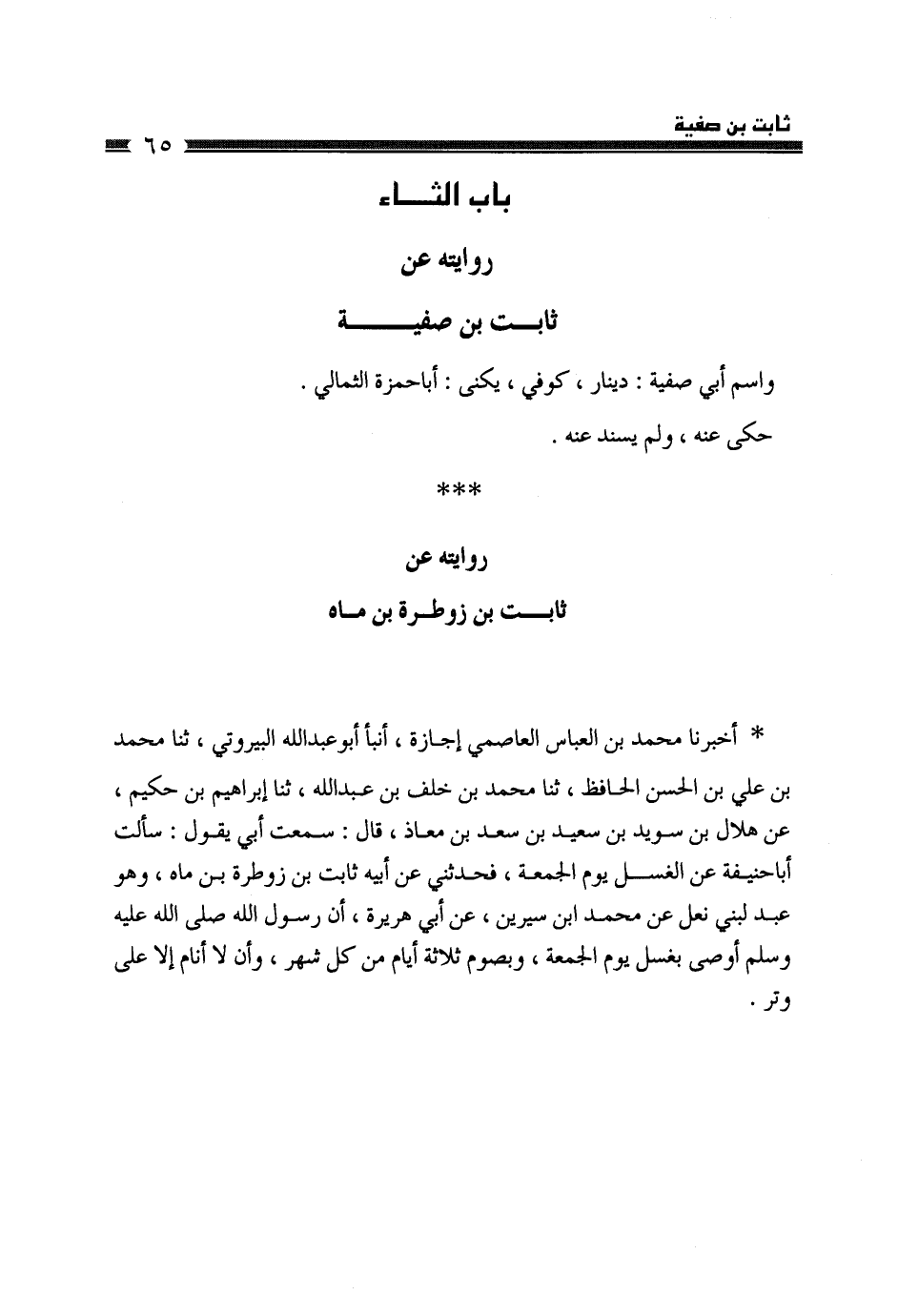 أَخْبَرَنَا مُحَمَّدُ بْنُ الْعَبَّاسِ الْعَاصِمِيُّ، إِجَازَةً، أنبأ أَبُو عَبْدِ اللَّهِ الْبَيْرُوتِيُّ، ثَنَا مُحَمَّدُ بْنُ عَلِيِّ بْنِ الْحَسَنِ الْحَافِظُ، ثَنَا مُحَمَّدُ بْنُ خَلَفِ بْنِ عَبْدِ اللَّهِ، ثَنَا إِبْرَاهِيمُ بْنُ حَكِيمٍ، عَنْ هِلَالِ بْنِ سُوَيْدِ بْنِ سَعِيدِ بْنِ سَعْدِ بْنِ مُعَاذٍ، قَالَ: سَمِعْتُ أَبِي يَقُولُ: سَأَلْتُ أَبَا حَنِيفَةَ عَنِ الْغُسْلِ يَوْمَ الْجُمُعَةِ فَحَدَّثَنِي عَنْ أَبِيهِ، ثَابِتِ بْنِ زَوْطَرَةَ بْنِ مَاهٍ وَهُوَ عَبْدٌ لِبَنِي نَعْلٍ، عَنْ مُحَمَّدِ بْنِ سِيرِينَ، عَنْ أَبِي هُرَيْرَةَ: «أَنَّ رَسُولَ اللَّهِ صَلَّى اللهُ عَلَيْهِ وَسَلَّمَ §أَوْصَى بِغُسْلِ يَوْمِ الْجُمُعَةِ، وَبِصَوْمِ ثَلَاثَةِ أَيَّامٍ مِنْ كُلِّ شَهْرٍ، وَأَنْ لَا أَنَامَ إِلَّا عَلَى وِتْرٍ»