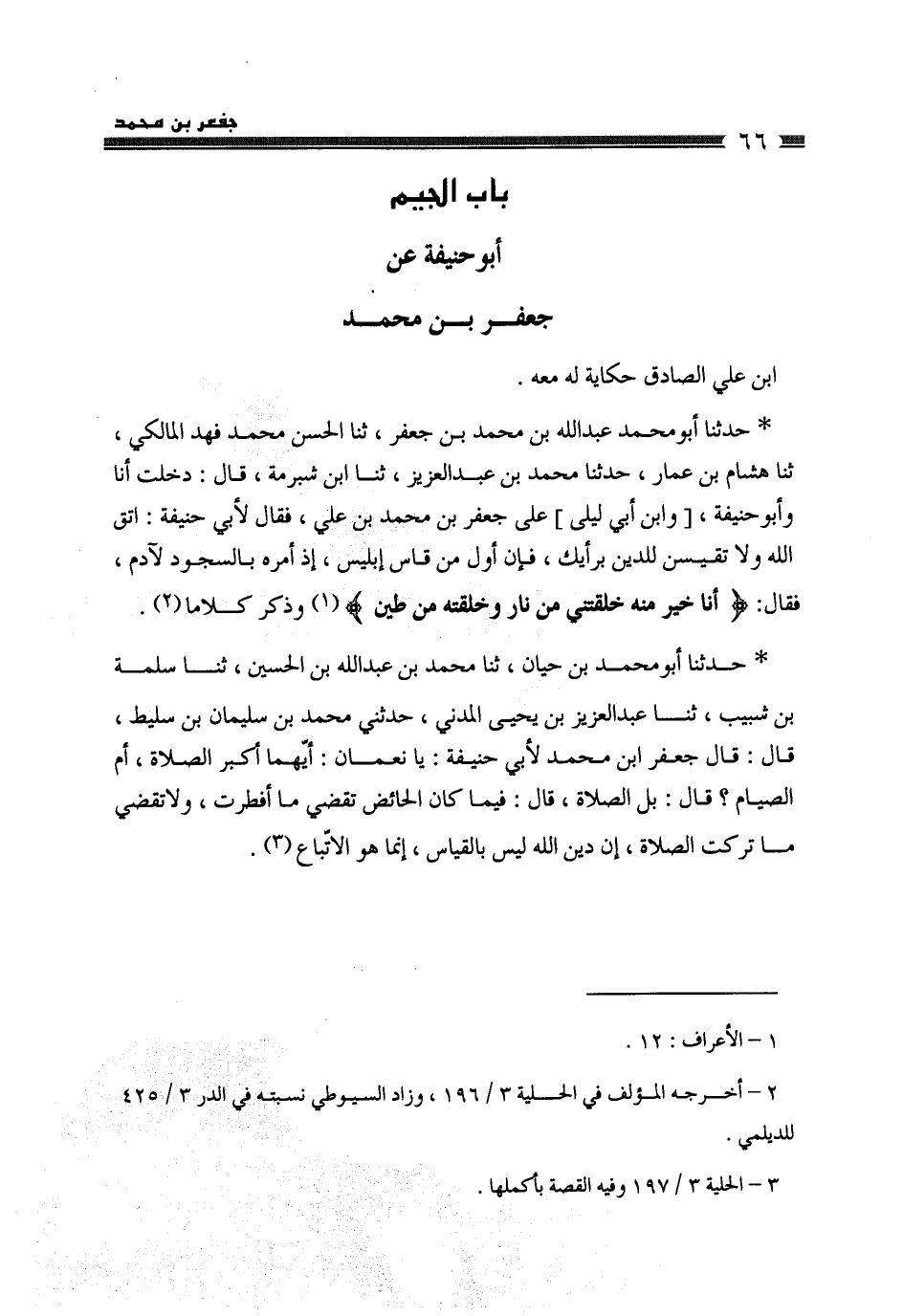حَدَّثَنَا أَبُو مُحَمَّدٍ عَبْدُ اللَّهِ بْنُ مُحَمَّدِ بْنِ جَعْفَرٍ، ثَنَا الْحَسَنُ بْنُ مُحَمَّدِ بْنِ فَهْدٍ الْمَالِكِيُّ، ثَنَا هِشَامُ بْنُ عَمَّارٍ، حَدَّثَنَا مُحَمَّدُ بْنُ عَبْدِ الْعَزِيزِ، ثَنَا ابْنُ شُبْرُمَةَ، قَالَ: دَخَلْتُ أَنَا وَأَبُو حَنِيفَةَ، وَابْنُ أَبِي لَيْلَى، عَلَى جَعْفَرِ بْنِ مُحَمَّدِ بْنِ عَلِيٍّ، فَقَالَ لِأَبِي حَنِيفَةَ: «§اتَّقِ اللَّهَ، وَلَا تَقِيسَنَّ لِلدِّينِ بِرَأْيِكَ، فَإِنَّ أَوَّلَ مَنْ قَاسَ إِبْلِيسُ، إِذْ أَمَرَهُ بِالسُّجُودِ لِآدَمَ، فَقَالَ: أَنَا خَيْرٌ مِنْهُ؛ خَلَقْتَنِي مِنْ نَارٍ، وَخَلَقْتَهُ مِنْ طِينٍ، وَذَكَرَ كَلَامًا»