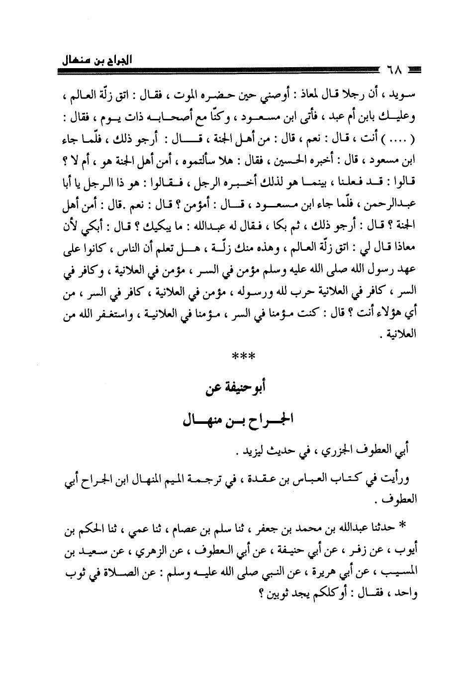 §أَبُو حَنِيفَةَ عَنِ الْجَرَّاحِ بْنِ مِنْهَالٍ أَبِي الْعَطُوفِ الْجَزَرِيِّ، فِي حَدِيثٍ لِيَزِيدَ وَرَأَيْتُ فِي كِتَابِ الْعَبَّاسِ بْنِ عُقْدَةَ، فِي تَرْجَمَةِ الْمِيمِ، الْمِنْهَالَ بْنَ الْجَرَّاحِ أَبَا الْعَطُوفِ