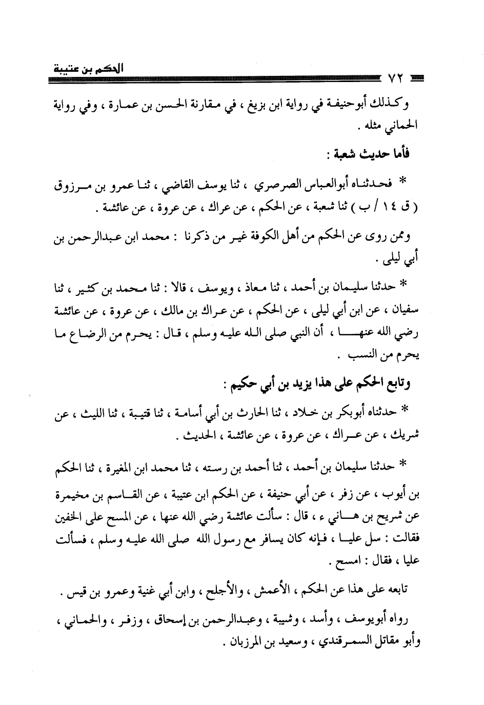 حَدَّثَنَا سُلَيْمَانُ بْنُ أَحْمَدَ، ثَنَا مُعَاذٌ، وَيُوسُفُ، قَالَا: ثَنَا مُحَمَّدُ بْنُ كَثِيرٍ، ثَنَا سُفْيَانُ، عَنِ ابْنِ أَبِي لَيْلَى، عَنِ الْحَكَمِ، عَنْ عِرَاكِ بْنِ مَالِكٍ، عَنْ عُرْوَةَ، عَنْ عَائِشَةَ، رَضِيَ اللَّهُ عَنْهَا، أَنَّ النَّبِيَّ صَلَّى اللهُ عَلَيْهِ وَسَلَّمَ قَالَ: «§يَحْرُمُ مِنَ الرَّضَاعِ مَا يَحْرُمُ مِنَ النَّسَبِ» وَتَابَعَ الْحَكَمَ عَلَى هَذَا يَزِيدُ بْنُ أَبِي حَكِيمٍ حَدَّثَنَاهُ أَبُو بَكْرِ بْنُ خَلَّادٍ، ثَنَا الْحَارِثُ بْنُ أَبِي أُسَامَةَ، ثَنَا قُتَيْبَةُ، ثَنَا اللَّيْثُ، عَنْ شَرِيكٍ، عَنْ عِرَاكٍ، عَنْ عُرْوَةَ، عَنْ عَائِشَةَ، الْحَدِيثَ