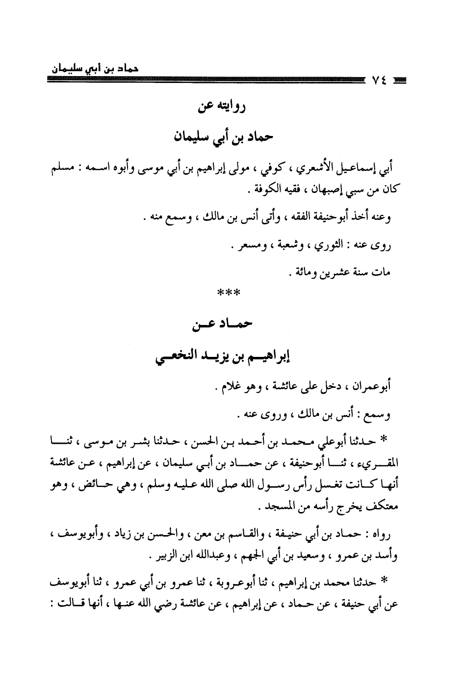 2 - §رِوَايَتُهُ عَنْ حَمَّادِ بْنِ أَبِي سُلَيْمَانَ أَبِي إِسْمَاعِيلَ الْأَشْعَرِيِّ، كُوفِيٌّ، مَوْلَى إِبْرَاهِيمَ بْنِ أَبِي مُوسَى، وَأَبُوهُ اسْمُهُ مُسْلِمٌ، كَانَ مِنْ سَبْيِ أَصْبَهَانَ، فَقِيهُ الْكُوفَةِ وَعَنْهُ أَخَذَ أَبُو حَنِيفَةَ الْفِقْهَ، وَأَتَى أَنَسَ بْنَ مَالِكٍ وَسَمِعَ مِنْهُ. رَوَى عَنْهُ الثَّوْرِيُّ وَشُعْبَةُ وَمِسْعَرٌ مَاتَ سَنَةَ عِشْرِينَ وَمِائَةٍ